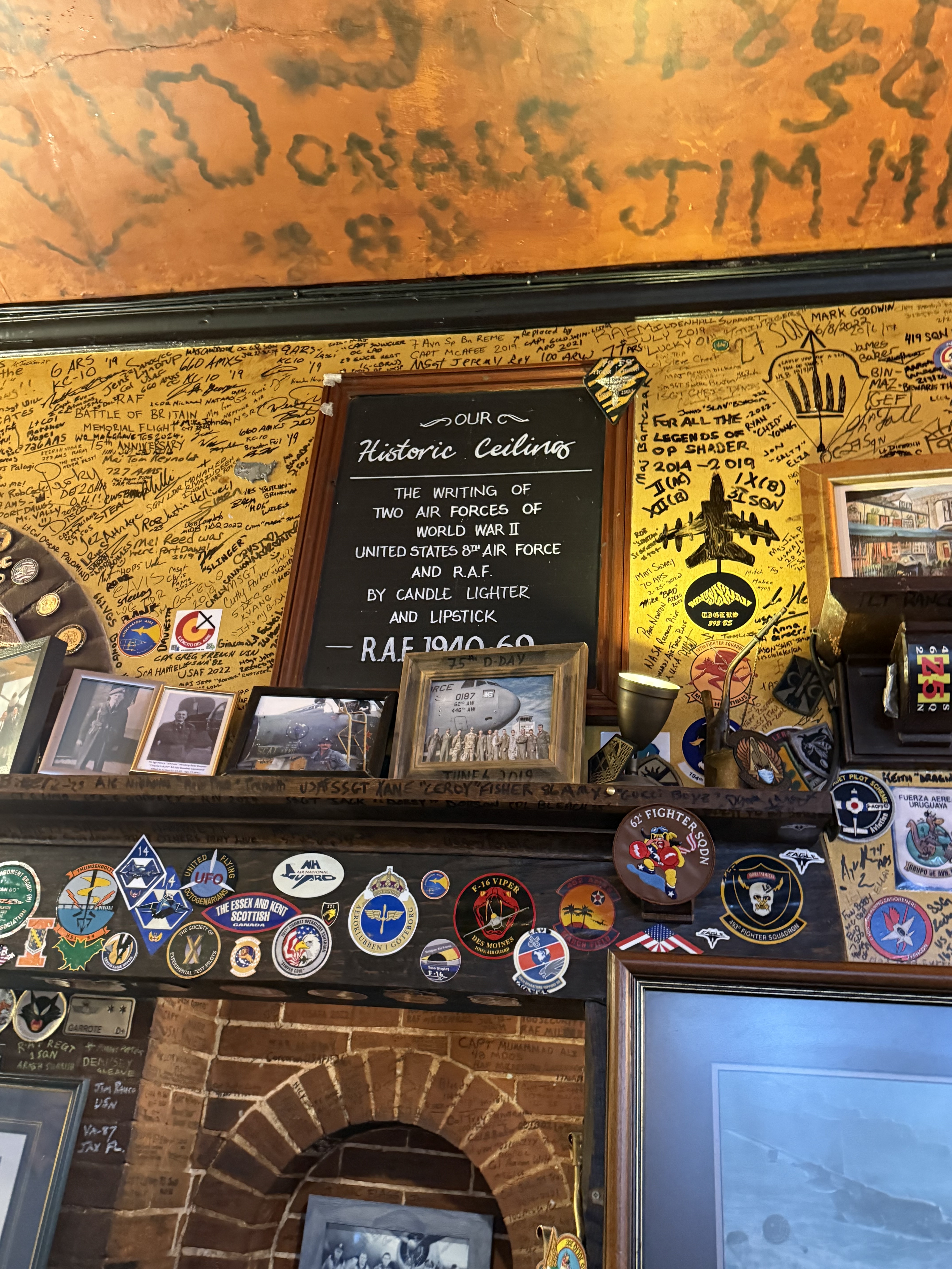 Daarna lunchten we in The Eagle, waar ik precies bij de tafel zat waar Crick en Watson hun succes vierden. Wat ik niet wist: die pub heeft nog een geheel eigen militaire geschiedenis. In de oorlog was het een soort thuisbasis voor RAF- en US-piloten. Ze dronken er hun laatste bier voor ze de lucht in gingen. En voor velen was het echt hun laatste bier. Met kaarsenrook en lippenstift schreven ze hun namen op het plafond. Het is sinds die tijd een bedevaartsoord voor militaire vliegers. Een hele bijzondere plek!