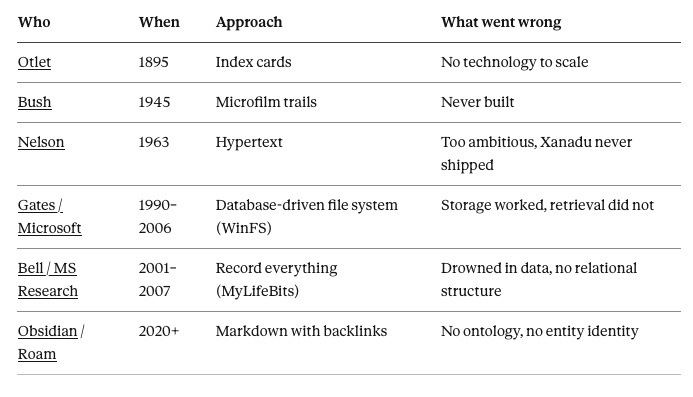 Every serious attempt at building a personal knowledge system in the past 180 years started from the same assumption: the problem is storage and retrieval. How do I save this? How do I find it back?
