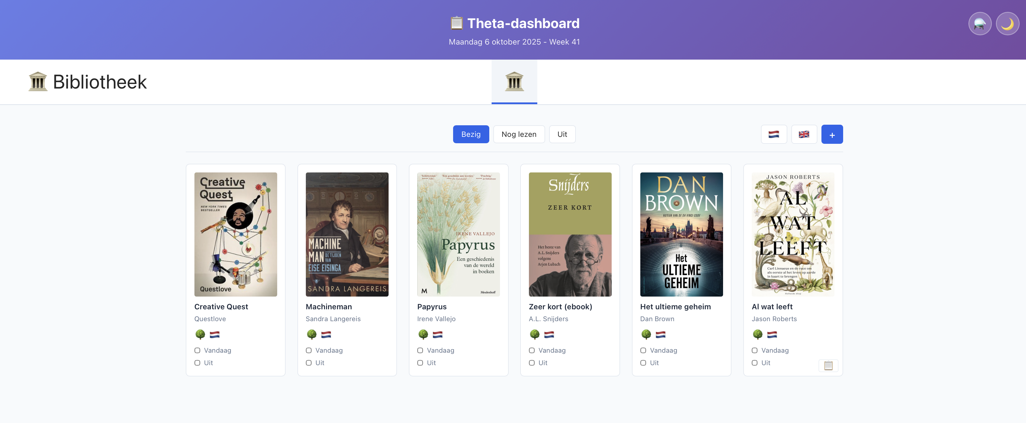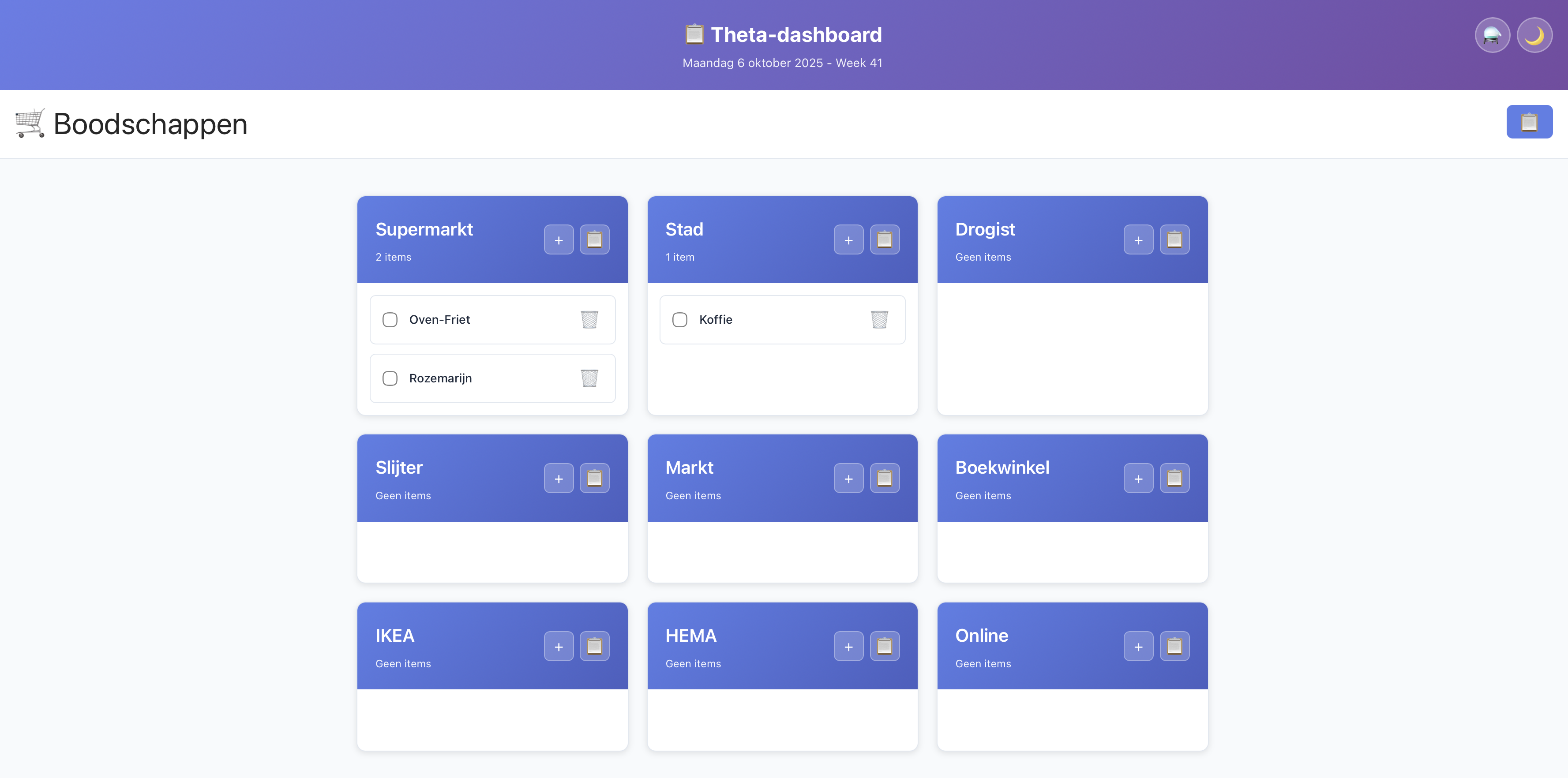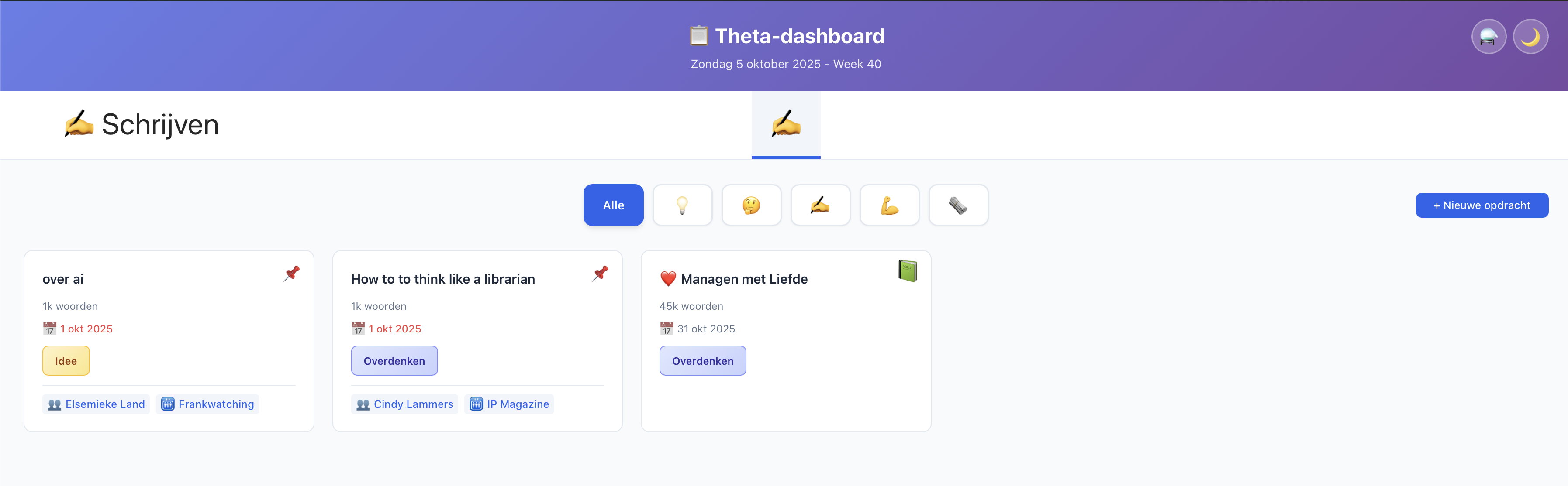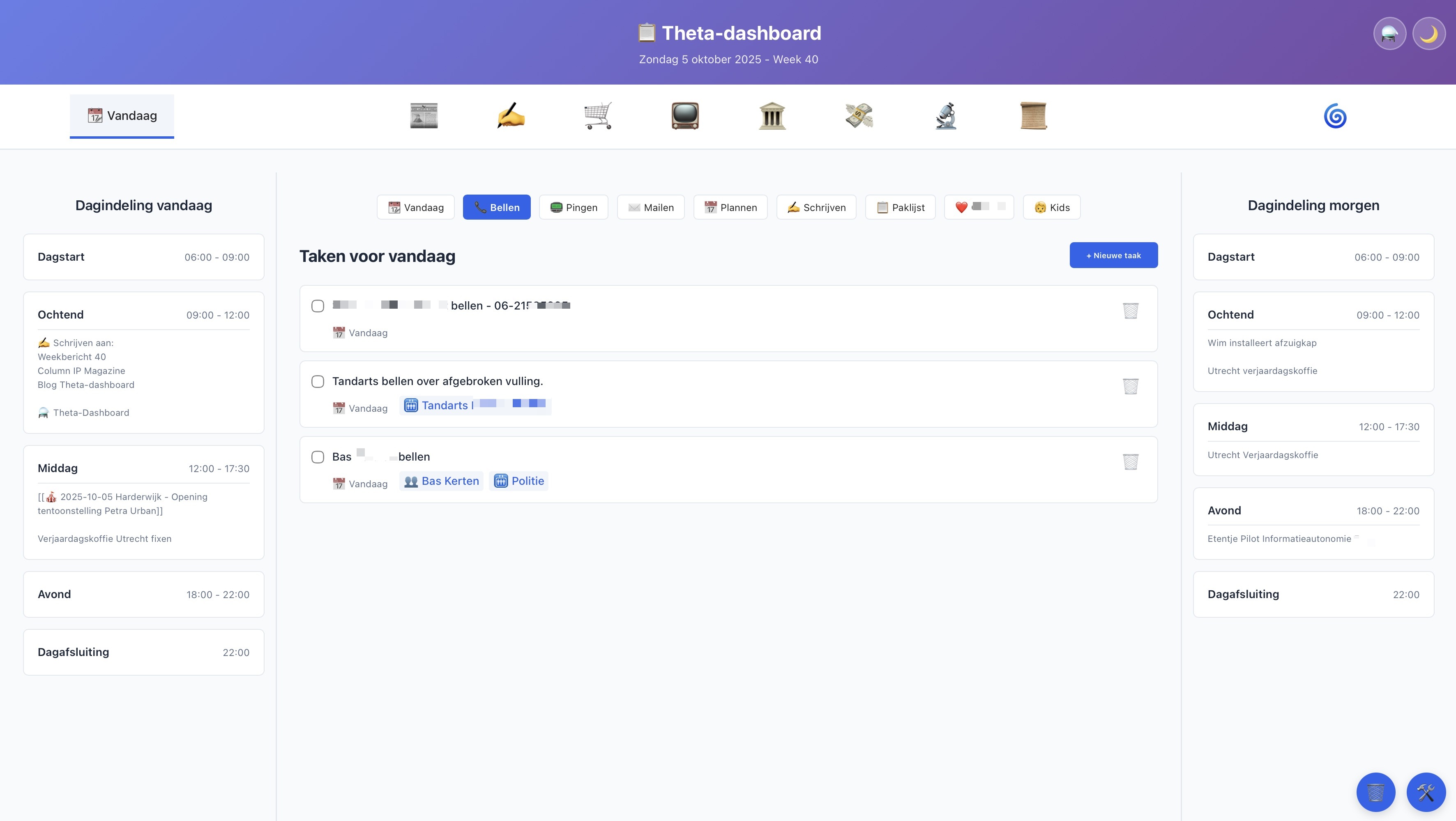 Het leek me grappig om dat als naam voor mijn project te gebruiken. Maar wat ik inmiddels aan het creëren ben, kan onmogelijk nog een taken-app genoemd worden. Ik vond een betere naam: mijn Theta-dashboard.