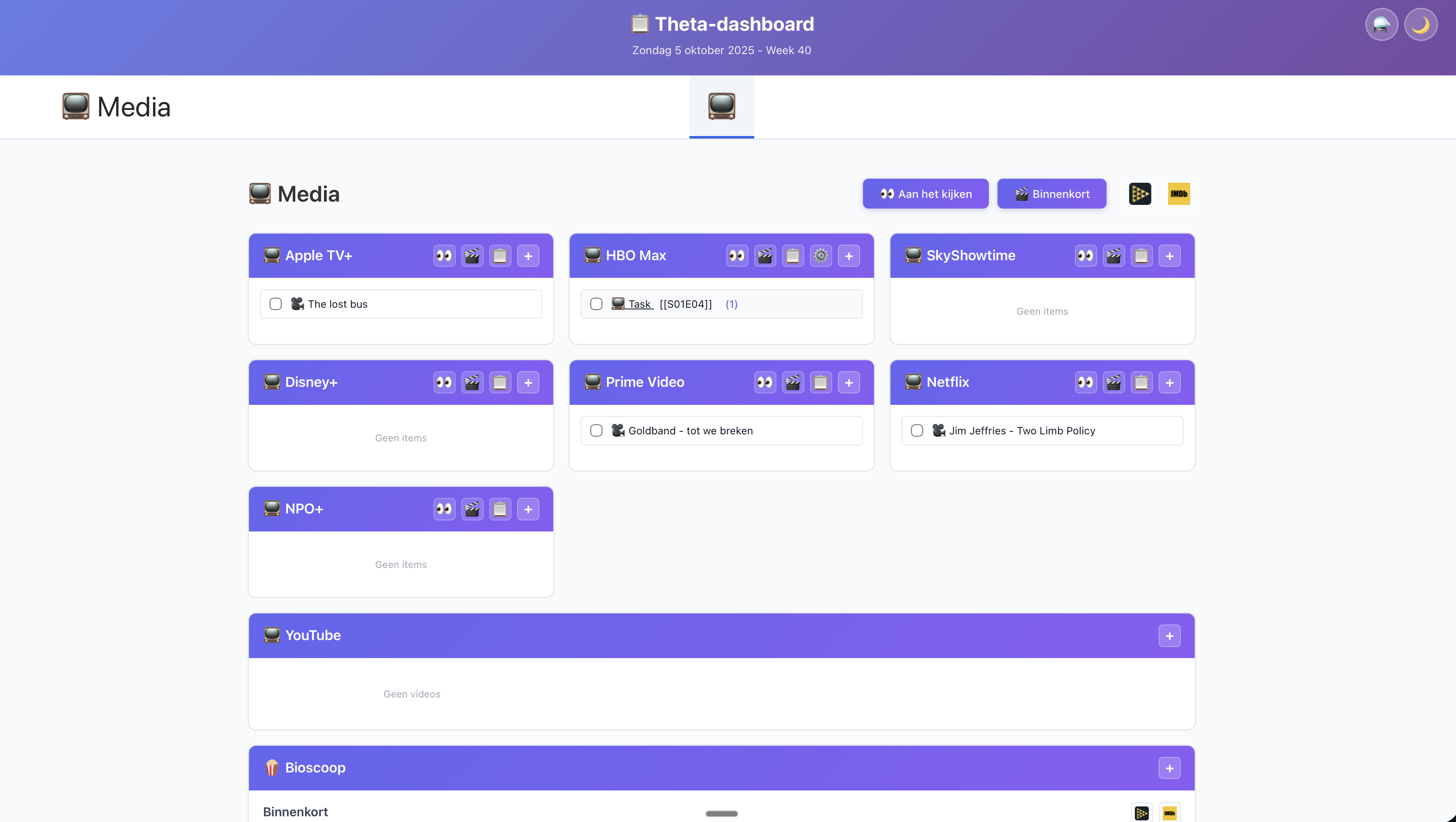 Binnen mijn Theta-dashboard heb ik ook een experimenteerruimte. Daar test ik nieuwe ideeën. Bijvoorbeeld: hoe taken die ik afvink automatisch in mijn Daily Note in Obsidian kunnen komen. Of mijn nieuwste experiment: ik wil alleen maar een IMDb-URL hoeven te geven, en dan moet de naam van de serie, de seizoenen, het aantal episodes, het uitzendschema en de streamingdienst volautomatisch in mijn mediasysteem verschijnen.