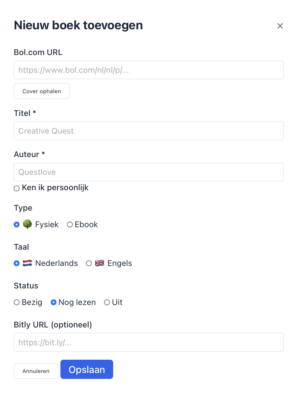 Ik bedacht dat veel info van een boek wel in de url van Bol.com staat. Door die url boven in dit menu te kopiëren, wordt vrijwel alle info eronder vanzelf ingevuld, inclusief de cover (dit maken kostte me een half uur). Met als gevolg dat het boek op de door mij gewenste manier wordt opgeslagen in Obsidian, maar ook zichtbaar is in deze lijst: