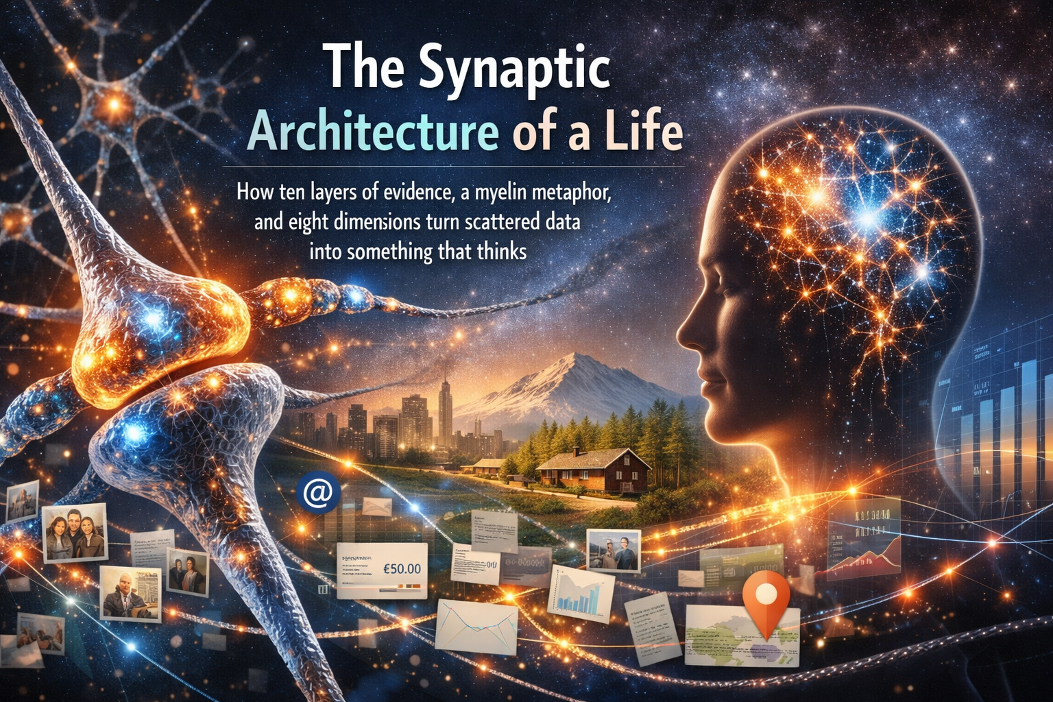 How ten layers of evidence, a myelin metaphor, and eight dimensions turn scattered data into a graph that knows more than you remember.