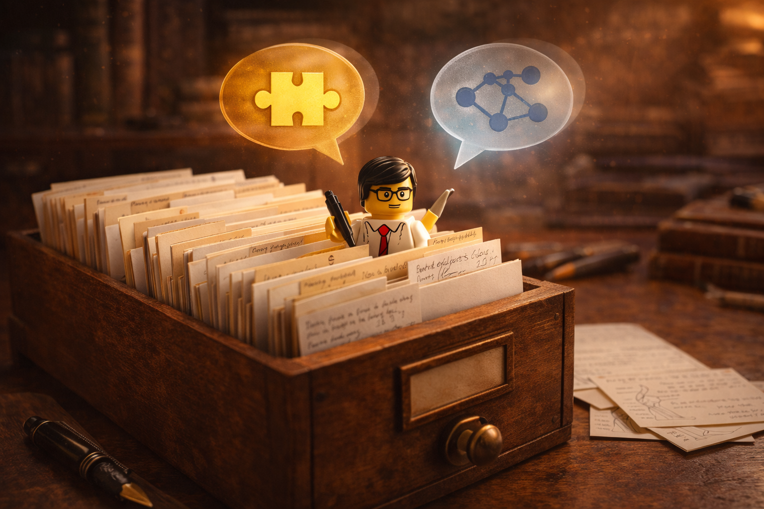 Maar Luhmann werkt met papier. Handmatig. Alleen met ideeën. Geen locaties, geen mensen, geen gebeurtenissen. Puur tekstueel, puur intellectueel. En het verbinden zelf is het denkwerk: je moet actief kaartjes aan elkaar koppelen.