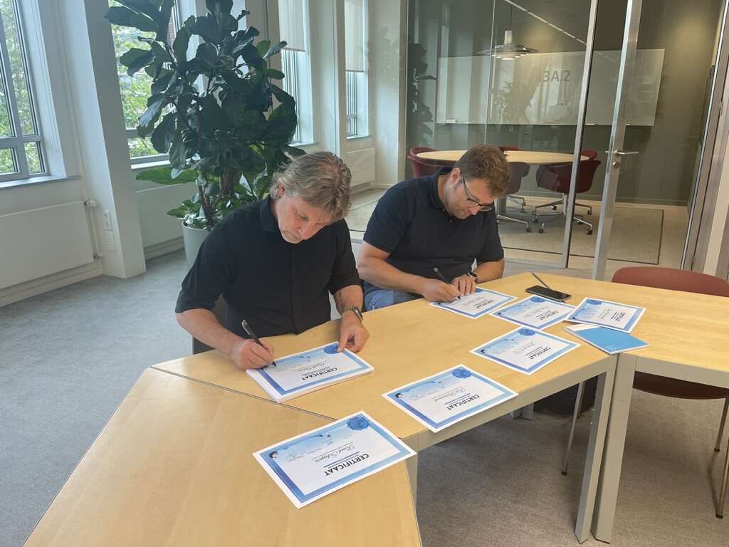 2. Onze Digitale Fitheid Academie had een mooie week! We leverden de tweede groep deelnemers aan onze leergang af. Feestelijk, zoals dat hoort. Online doen we veel met zo'n groep mooie dingen die in de fysieke wereld domweg niet mogelijk zijn. Wij zijn dus fan van online! Maar daar hoort wel bij dat je weet met wie je te maken hebt. Daarom starten én eindigen we die serie masterclasses en kenniscafé's fysiek. Met een drankje, hapje en fijn napraten. En een certificaat van deelname. Het is een kwestie van tijd voordat mensen met zo'n certificaat een streepje voor hebben bij sollicitaties. Mark en ik leggen er een hoop eer in om al die dingen persoonlijk te signeren.