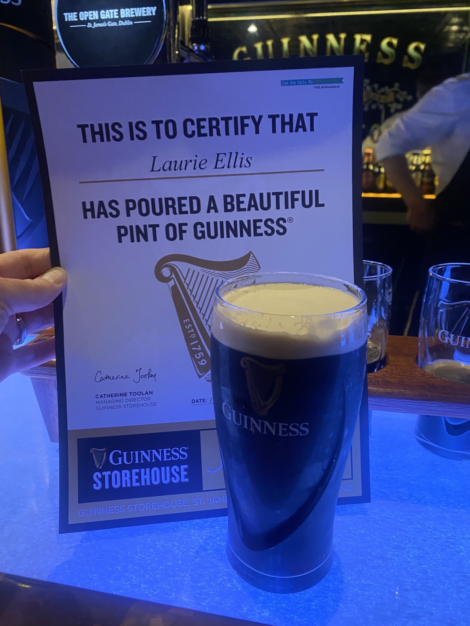 Our next stop was the Guinness Storehouse. We booked The Connoisseur experience. It is a bit more expensive, but you get to skip the line at the front door, you get a 1 hour private tasting (about 20 people in the hidden speak-easy). At the end of the tasting, you get to pour your own Guinness.