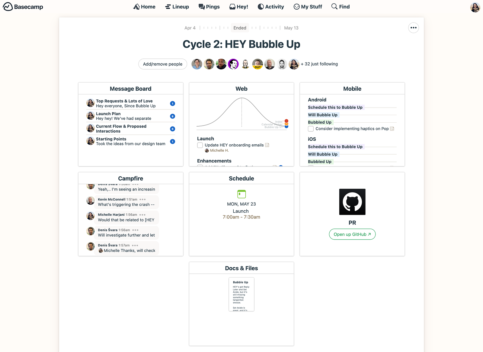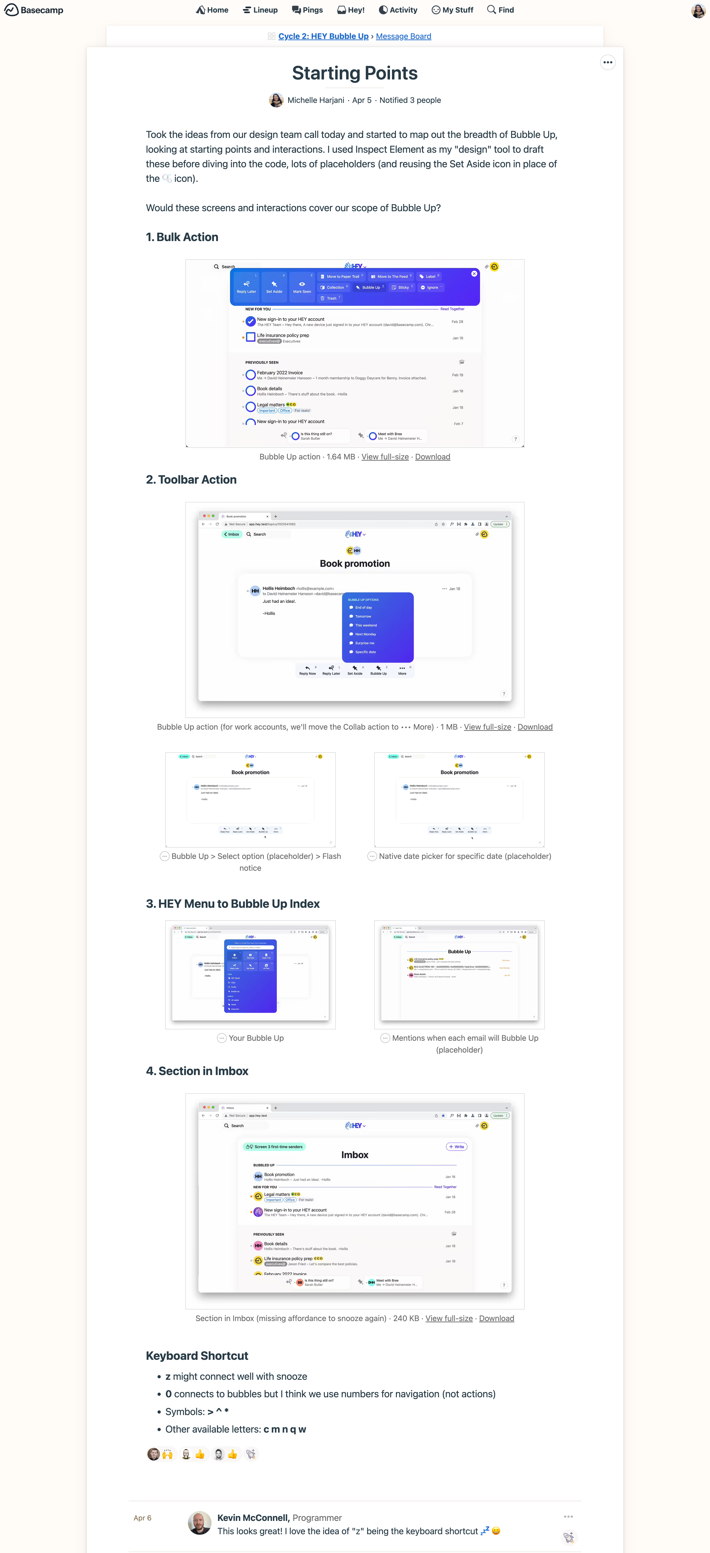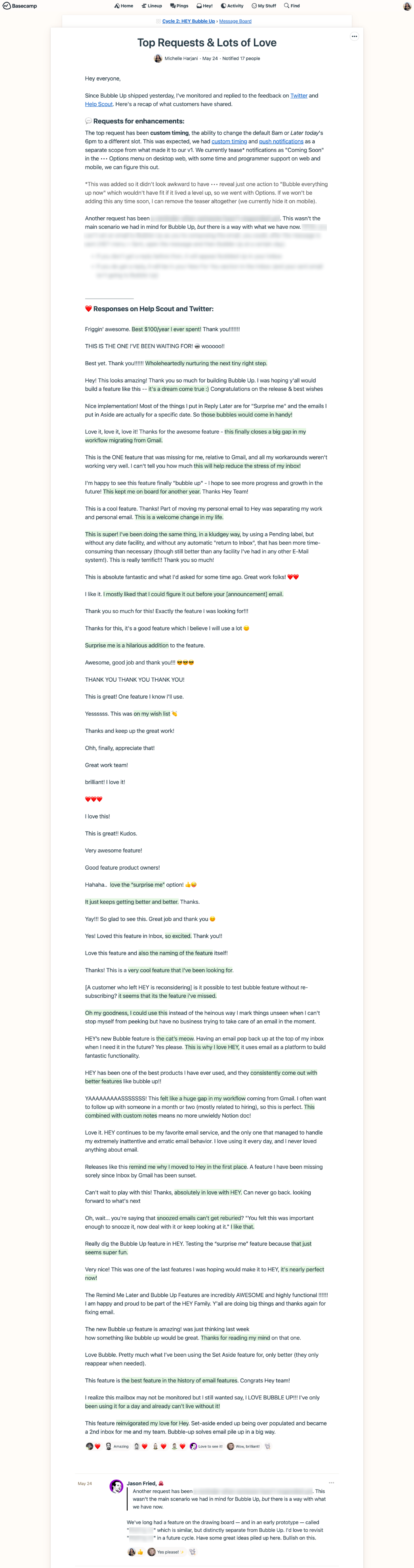 At the end of week 3, we had an all-hands with the product team for a mid-cycle review of the projects in flight. Different teams working on HEY and Basecamp shared updates and demos. I shared our progress on Bubble Up and we got some great feedback and suggestions from the team.