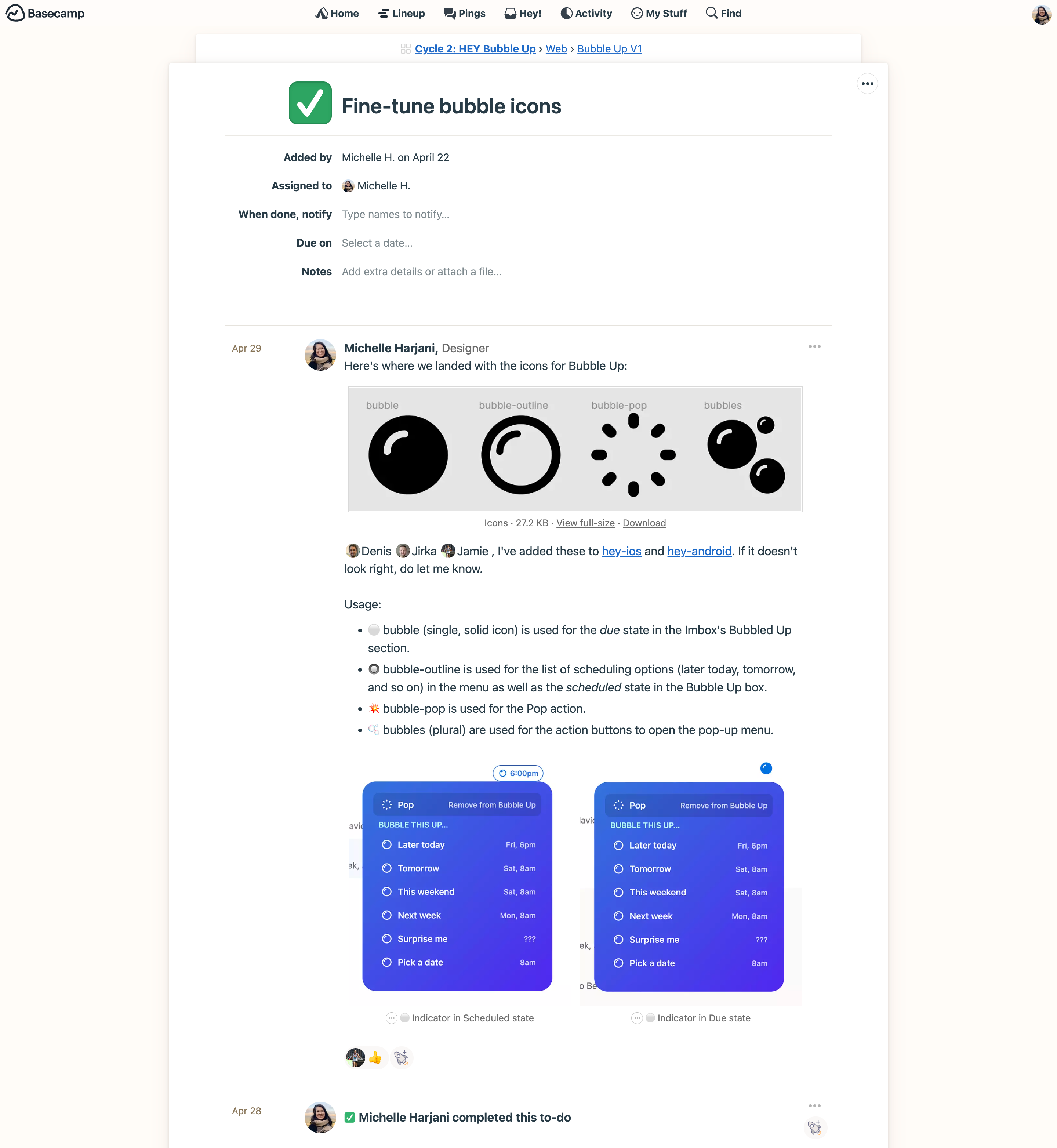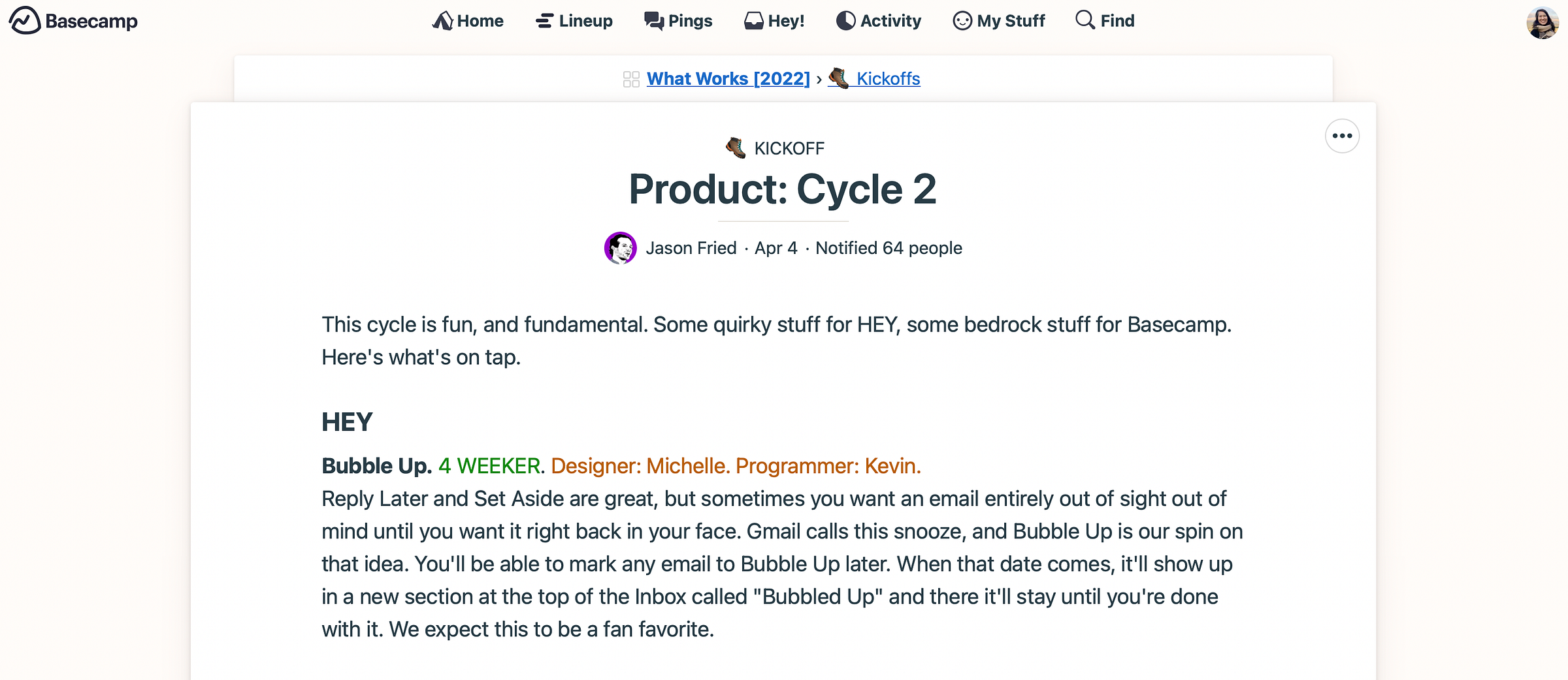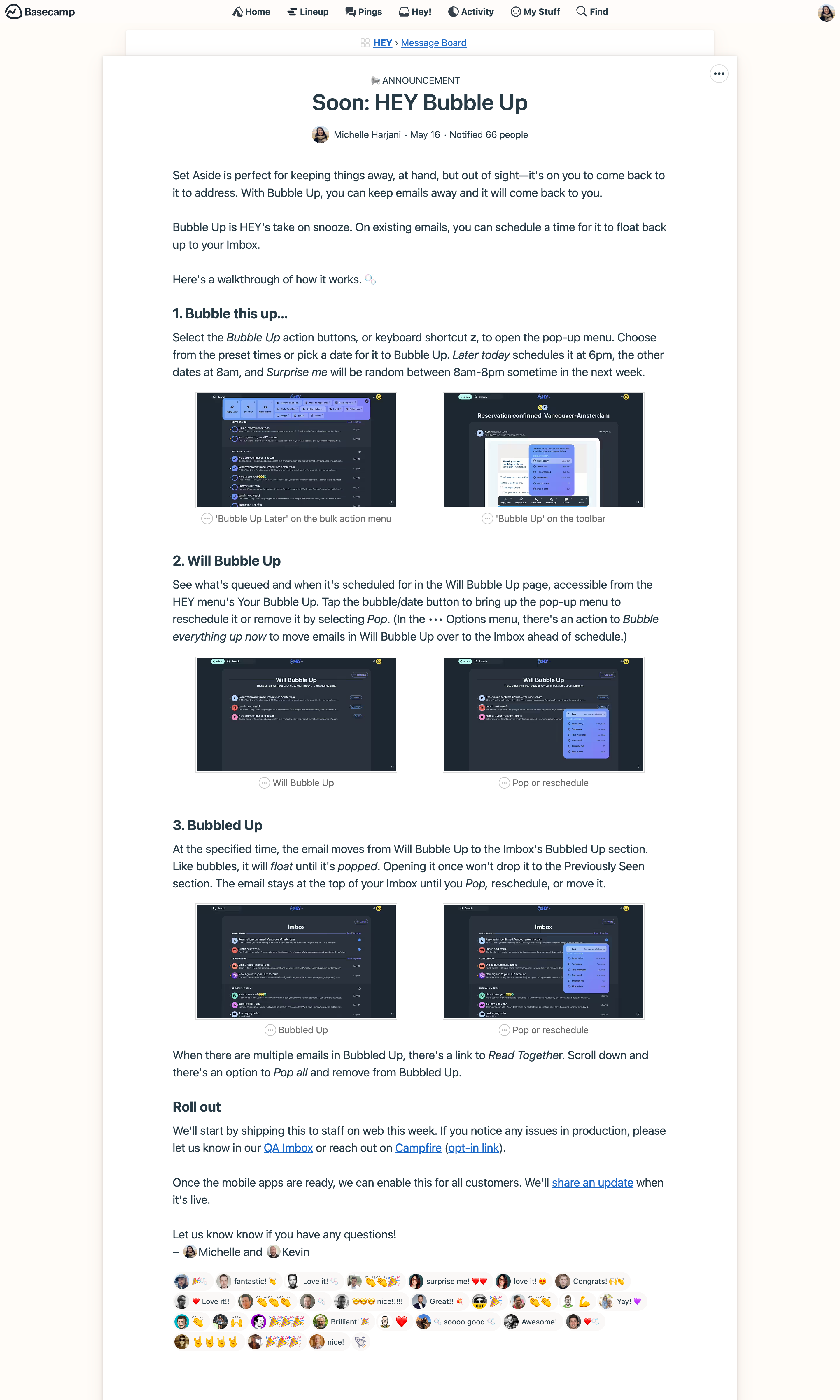 I’m Michelle, a senior product designer on the HEY team. For 2022’s Cycle 2, I worked on Bubble Up, HEY’s fresh take on snooze. Here’s my recap on the inner-workings of this feature and how we do it in Basecamp.