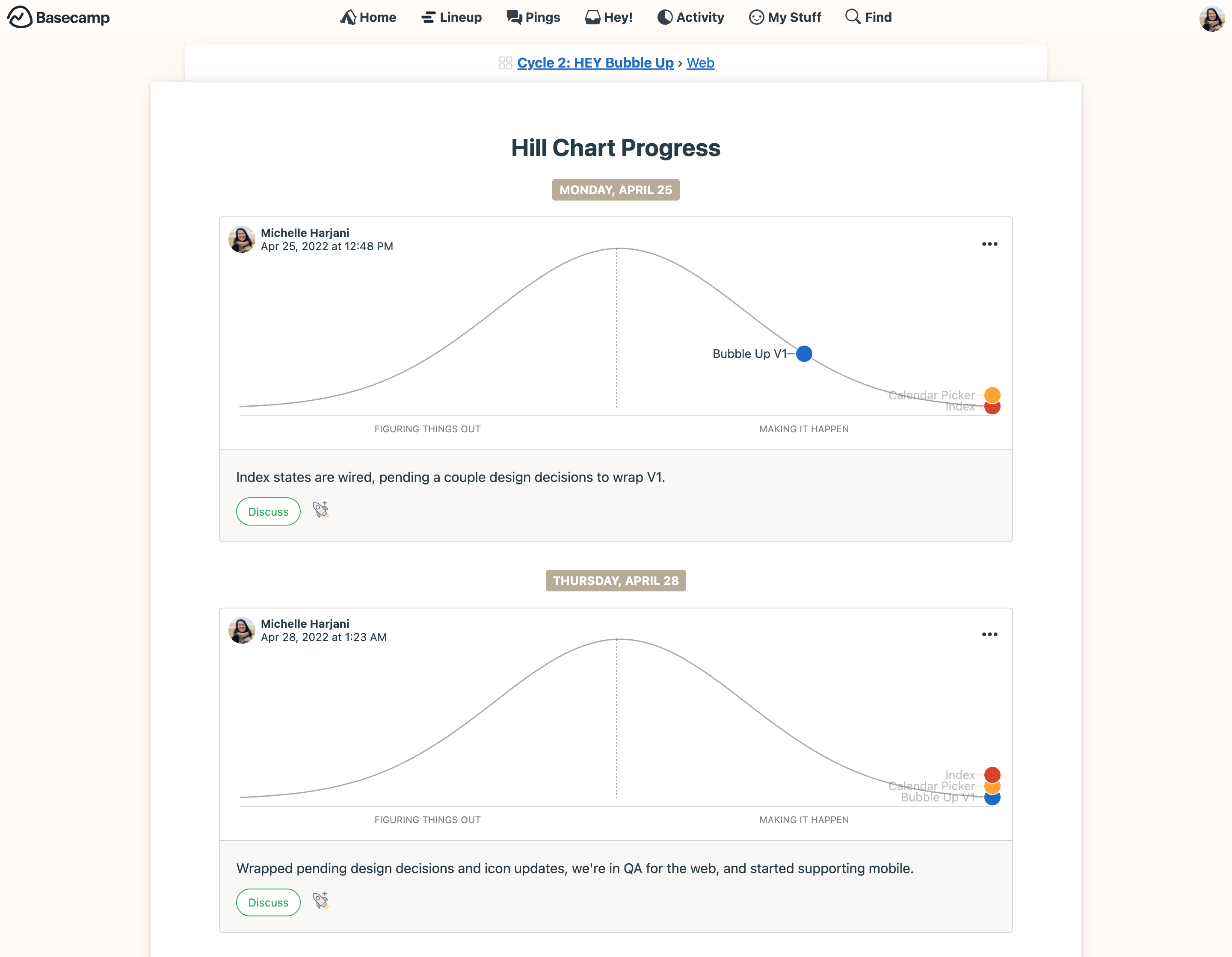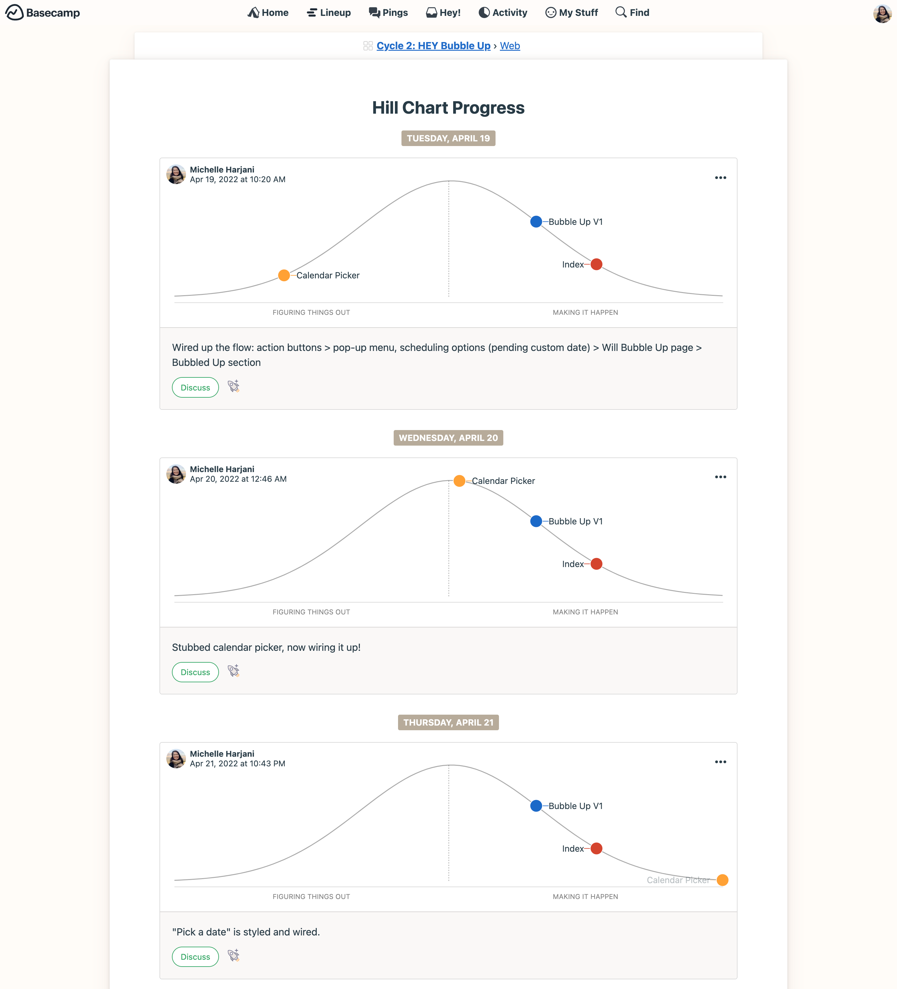 This week, I turned on the Hill Chart for the three to-do lists to visualize where we are on the hill, going from figuring things out towards making it happen.