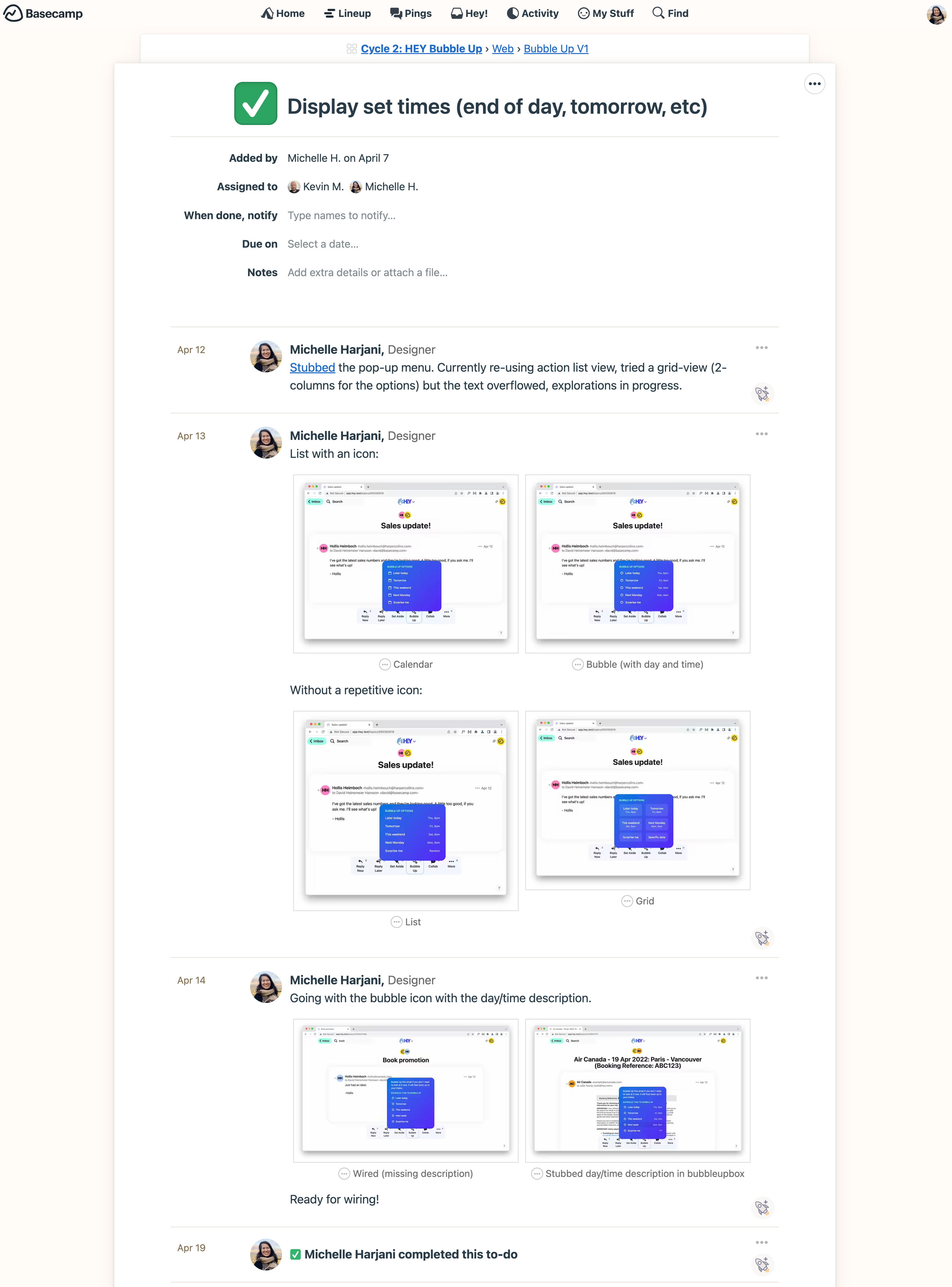 Our design team meets every Tuesday and we had a good riff with the team on Zoom. We discussed where the UI could live and some options for when to Bubble Up (today, tomorrow, this weekend, next Monday/Friday, and a custom date). Riffing on that last topic, I pitched Surprise me as an option. It’s in the spirit of HEY being fun and quirky so we decided then and there we’d add that, too!