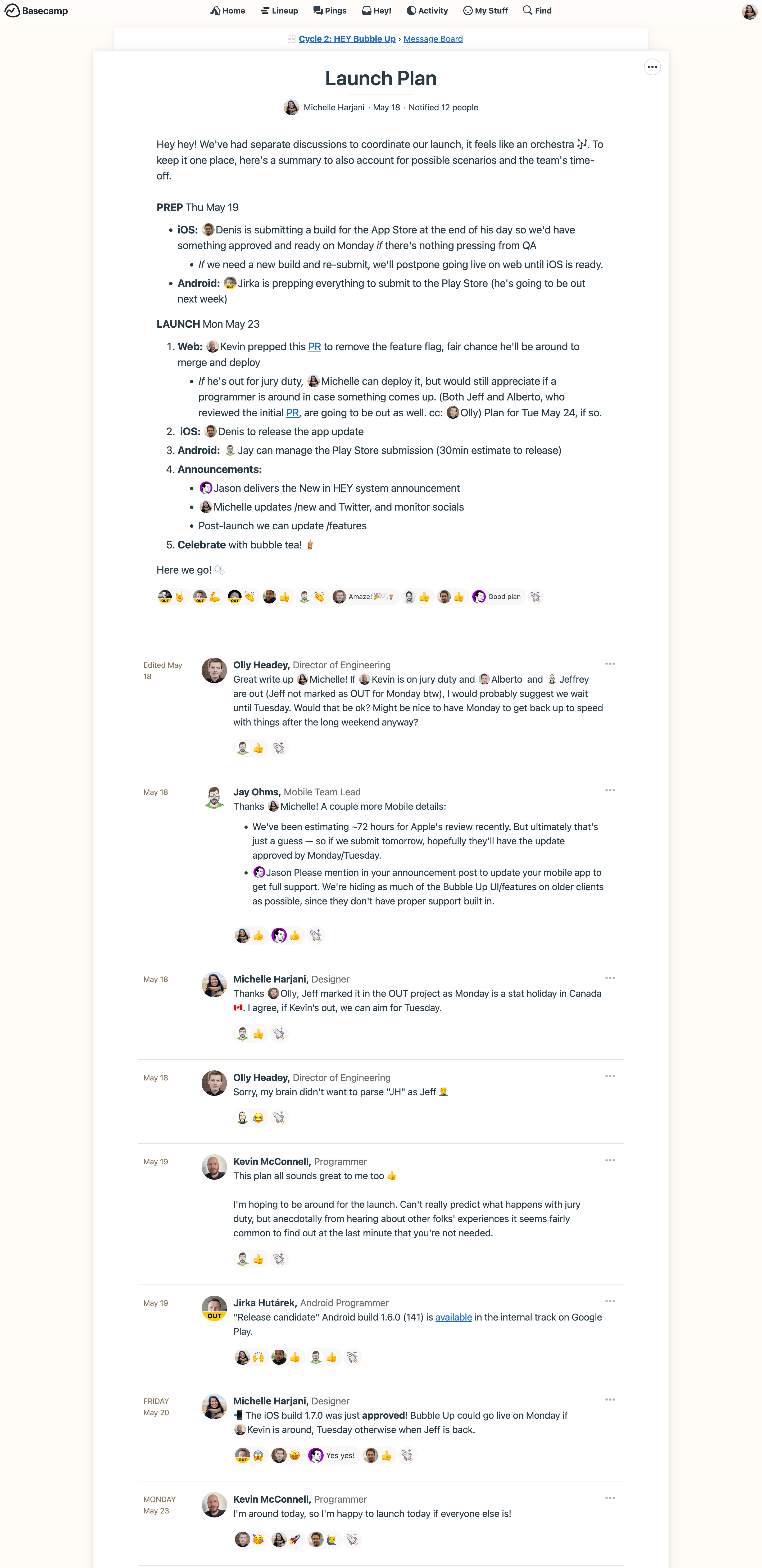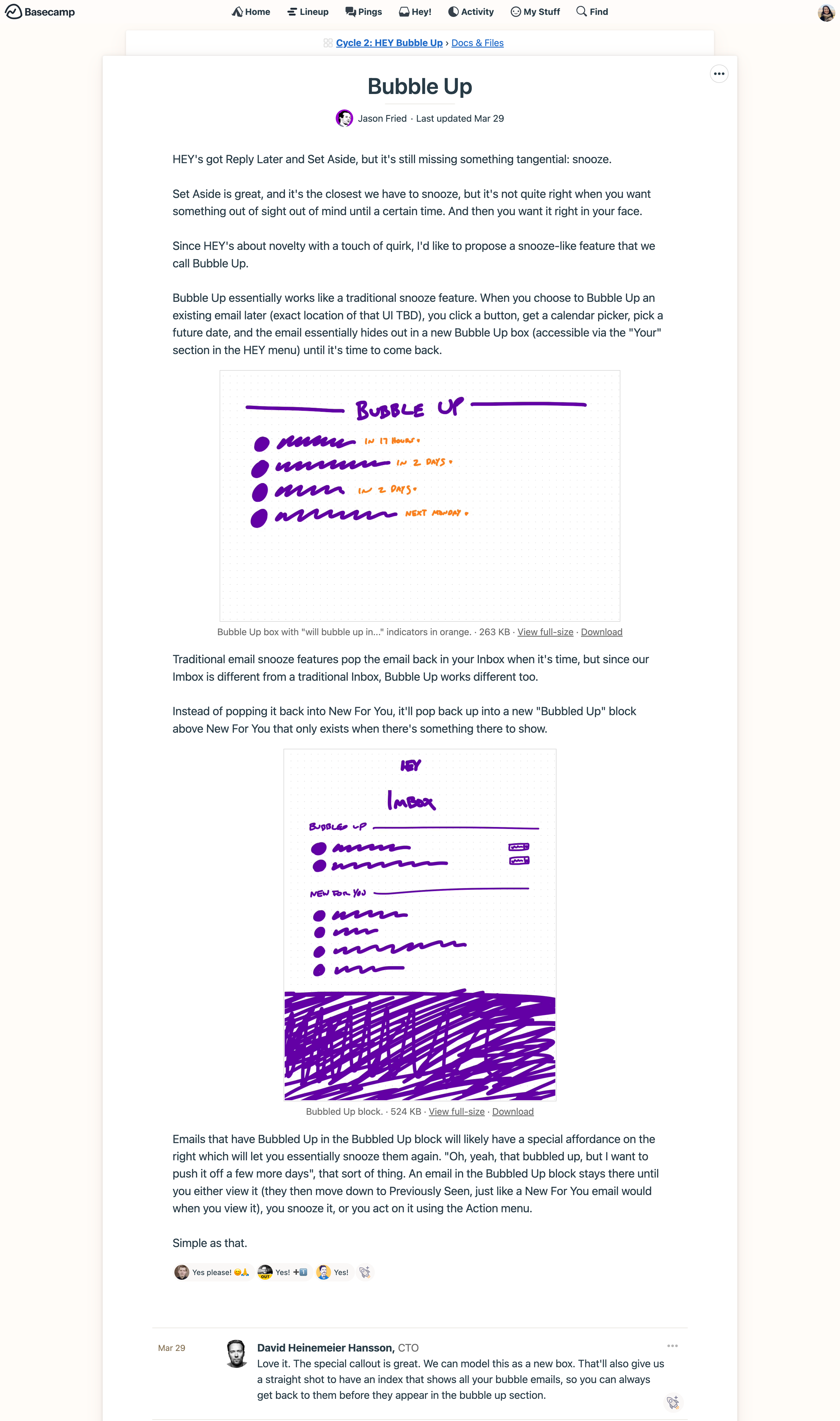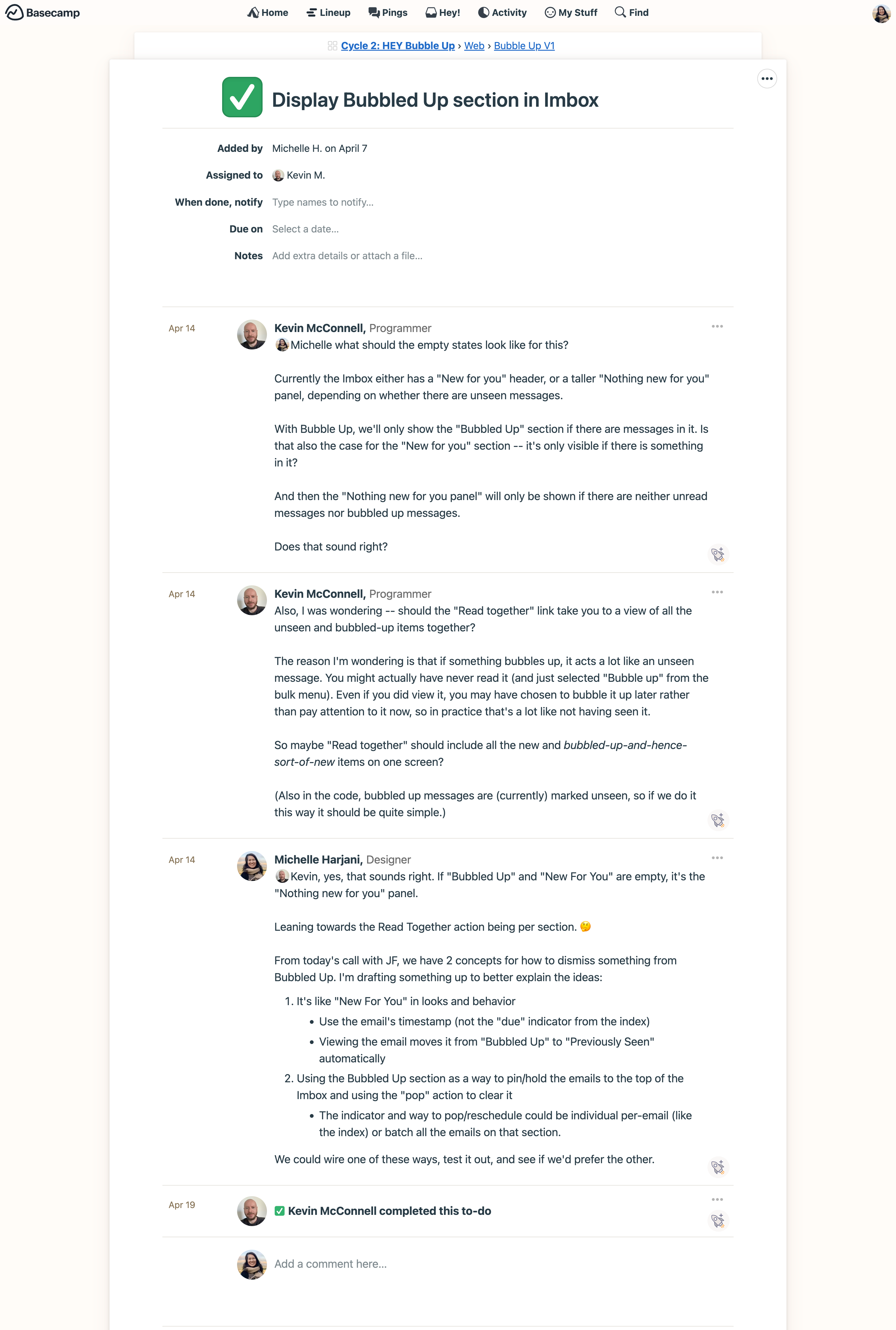 Now that we're using it for real, we get to feel it out. Maybe we find something didn't work as expected, maybe we missed something. Jason asked if an email Bubbled Up, and you reply to it, how should this behave? Oooh, I call this the puzzle at the 11th hour. I gave it some thought, ran through the flow, then replied. We had this discussion on the project's Campfire. We made the decision to stick to what we have, knowing we'll be right 50% of the time.