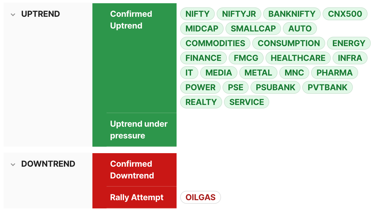⦿ Almost all indices are in a confirmed uptrend. ⦿ OilGas index is still under rally attempt. ⦿ There is no index in a confirmed downtrend.