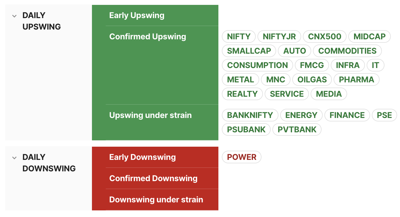 ⦿ Both Nifty & Smallcap are in a daily confirmed upswing and a weekly upswing. Swing Confidence is 100. ⦿ With the Bull swing in its 4th month, Nifty has resolved last week’s extended state via a little time correction & is now not much far away from the swing ribbon. ⦿ Majority of indices are in a confirmed upswing on daily timeframes. Power index is in early downswing.