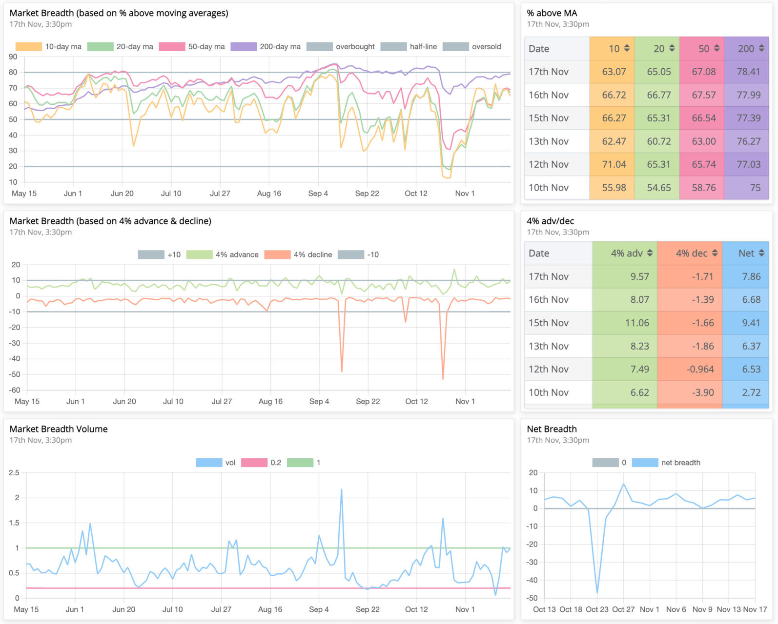 ⦿ Breadth as per moving averages: As % of stocks above both 10-day 20-day, & 50-day MA stay above 50, so we are are above the bullish threshold & the breadth is strong. The % of stocks above 200-day MA also stays in the bullish 70-80 range.