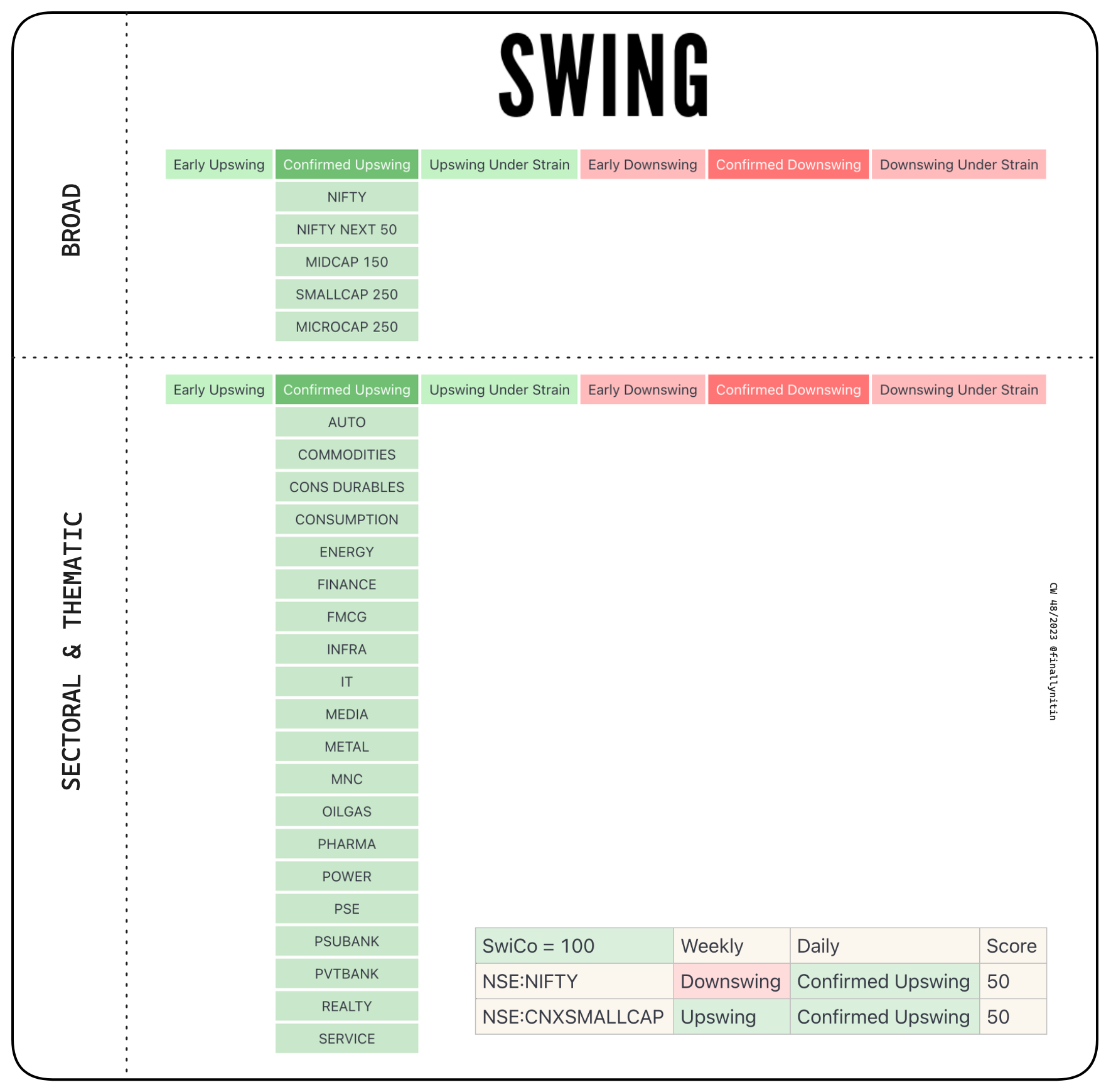 ⦿ As both Nifty & Smallcap 100 are in confirmed upswing, Swing Confidence is 100, which means that new or existing positions can be taken with the maximum permissible open risk.