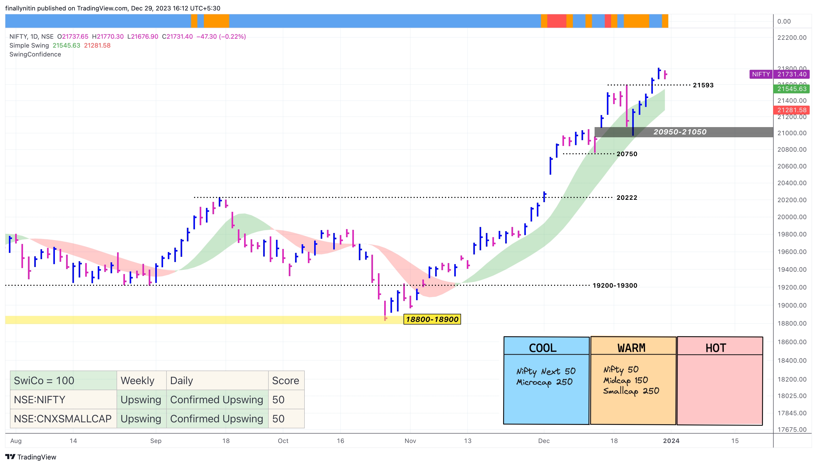 ⦿ Swing Temperature is warm, which means that new swing positions should be avoided or be taken with smaller sizes, & trailing stoplosses be tightened.