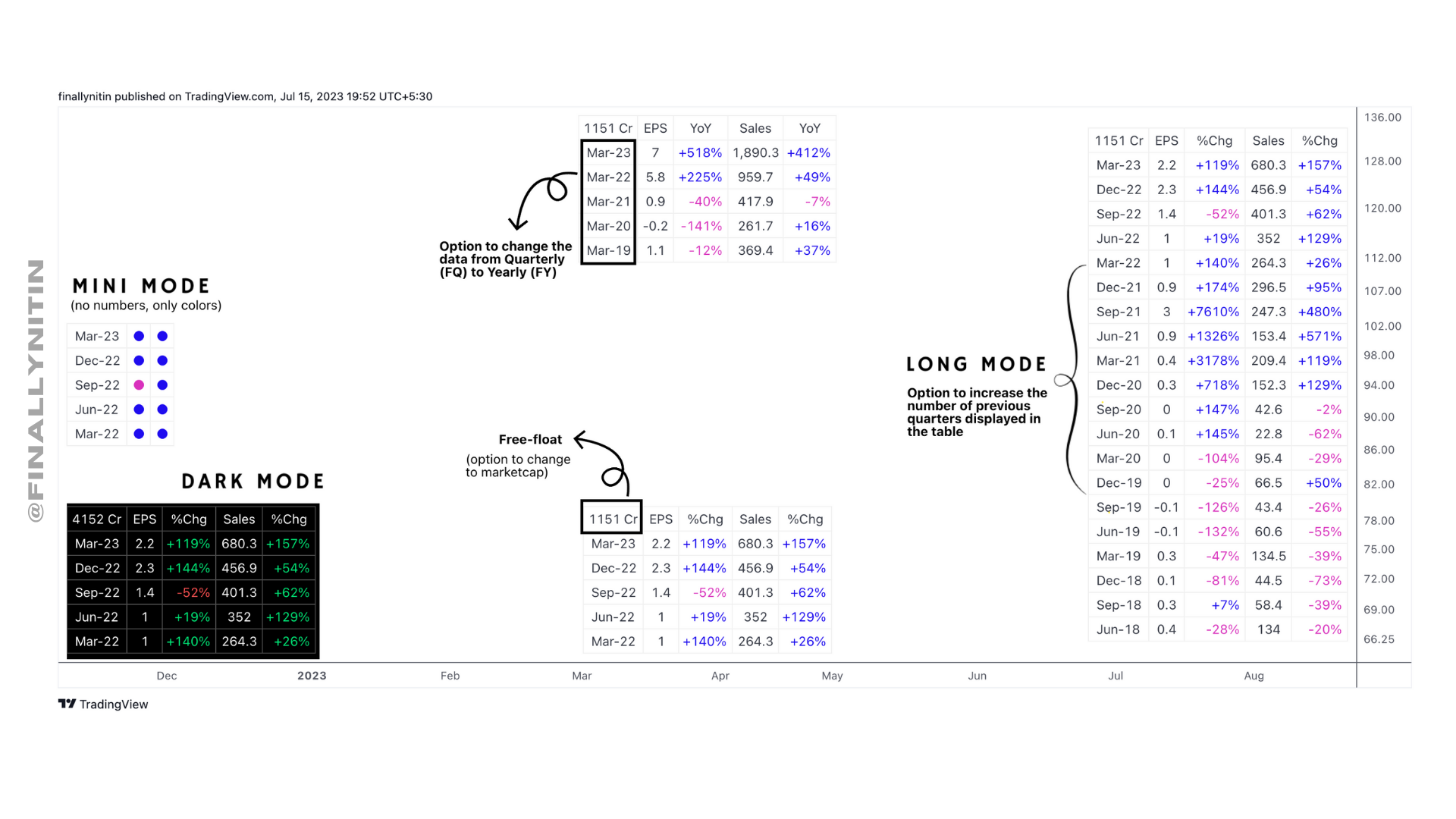 This script displays quarterly earnings per share (EPS) and sales data, and their year-on-year percentage change. The script builds upon the Volume Price and Fundamentals script by Mohit_Kakkar08 and improves upon the array functions to keep the code light-weight & the output as accurate as possible.
