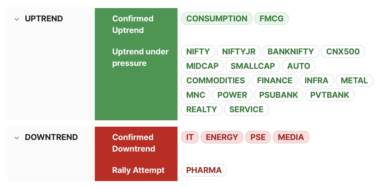 ⦿ Most indices are in an uptrend under pressure. FMCG & Consumption are in a confirmed uptrend. ⦿ IT, Media, Energy & PSE are in a confirmed downtrend. ⦿ Pharma is now in a rally attempt.