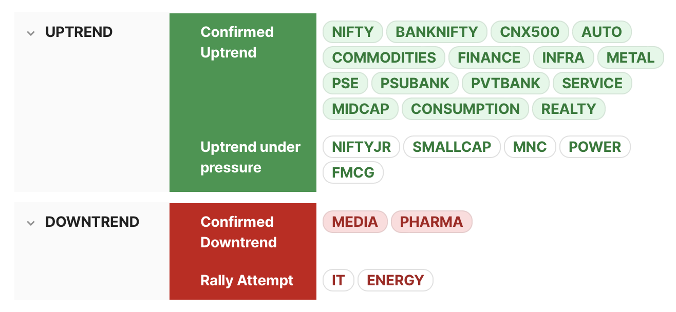 ⦿ Most indices are in a confirmed uptrend. ⦿ Among major indices, Smallcap & NiftyJr are still in uptrend under pressure. ⦿ Media & Pharma are in a confirmed downtrend. ⦿ IT & Energy are in a rally attempt.