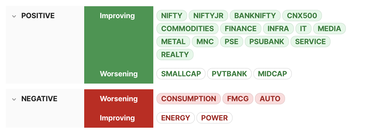 ⦿ Most major indices (including Nifty, NiftyJr, Banknifty & CNX500) have positive & improving momentum. ⦿ Smallcap & Midcap still have positive but worsening momentum. ⦿ Consumption, Auto & FMCG have negative & worsening momentum. ⦿ Long-term momentum will still take time to turn positive.