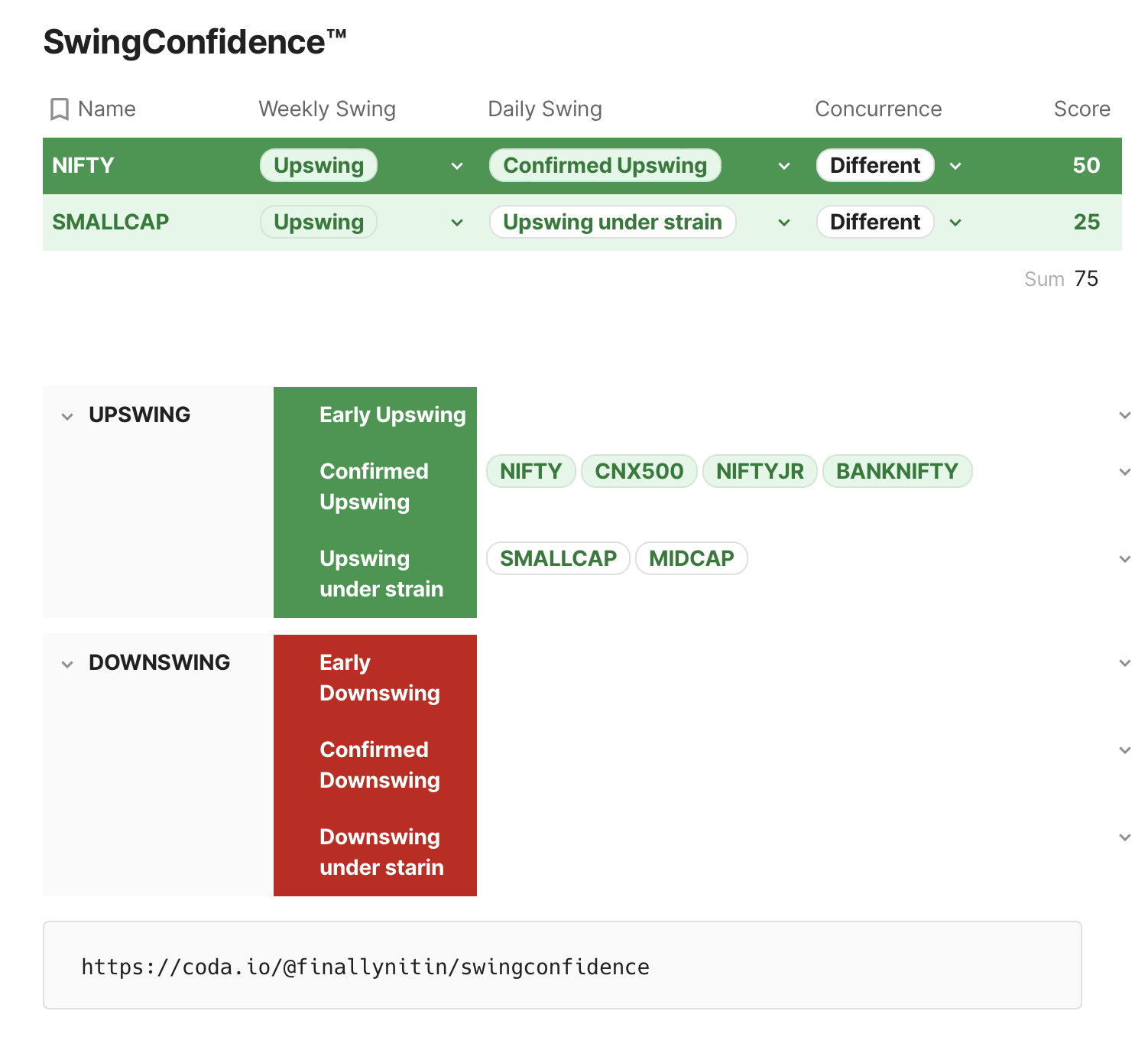⦿ Nifty is in Confirmed Upswing, while Smallcap is in upswing under strain. Both indices are in a weekly upswing. ⦿ Swing Confidence is 75. Long-only swing traders would be 75% invested, with 25% in cash. ⦿ Most indices are either in a confirmed upswing, or upswing under strain.