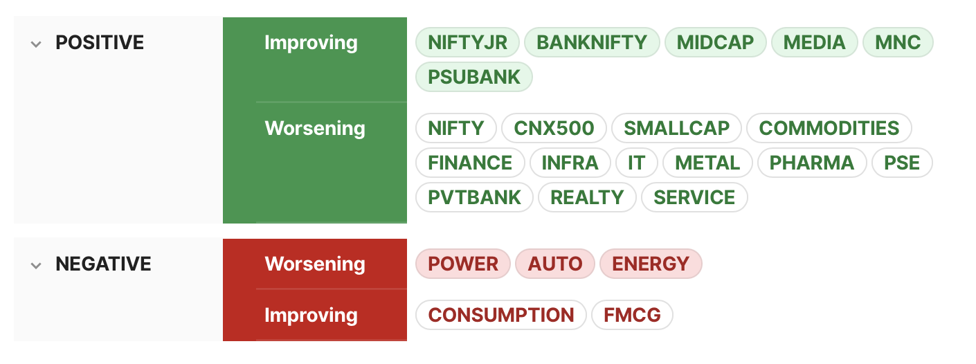 ⦿ NiftyJr, Banknifty & Midcap have positive & improving momentum. ⦿ Nifty, Smallcap & CNX500 have positive but worsening momentum. ⦿ Power, Auto & Energy have negative & worsening momentum.