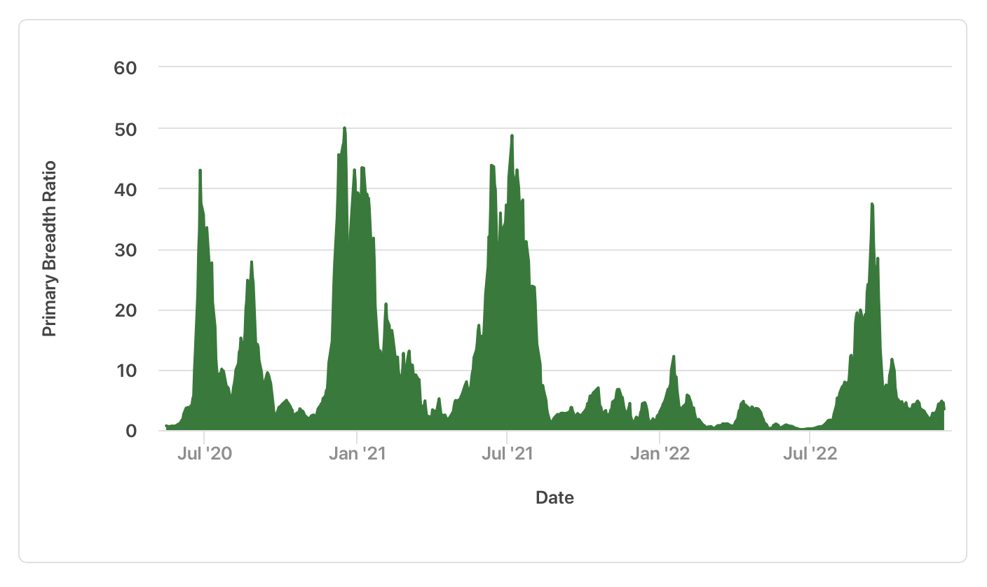 Overall, the market is bullish for 21th consecutive week, as the number of stocks up 25% plus in a quarter stays greater than that down 25% plus in a quarter. The ratio between the two is the primary breadth ratio, which is now 3.4, which is lesser than last week.