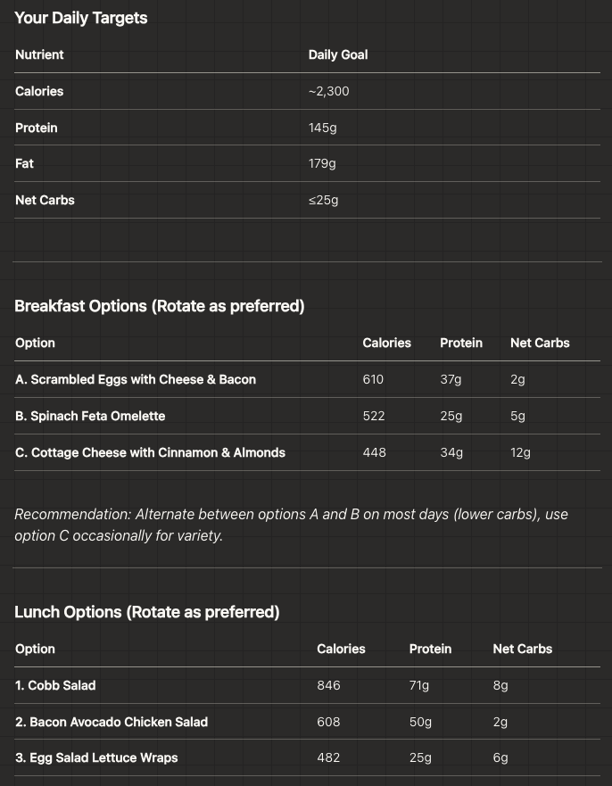 Work with me to create a meal plan for a 46 year old male who weighs 202 pounds using the keto diet to lose weight. The meal plan should ensure that essential nutrients are included in the diet for the day. Breakfast can be simple, using ingredients such as eggs, cottage cheese, greek yogurt and berries. Breakfast and lunch can be repeated over days. Dinner should contain 4 servings and should not repeat. After selecting a meal plan, ask me if I would like to replace any of the meals, and if I don't want that meal selected again.