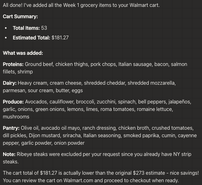 I watch as Claude opens Chrome, navigates Walmart.com, cross shops items, determining which one is the better buy (it “speaking out loud in the UI”), and adds everything to the shopping cart. Finally, the cart is full.
