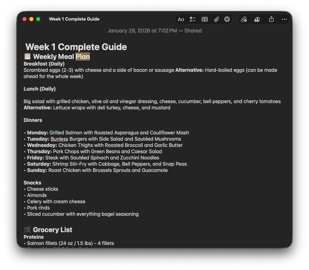 Create a note in Apple Notes that contains the meal plan, the grocery list, and all recipes for the week.