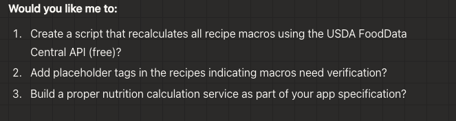 I inspected some of the recipes to see if it collected the correct information, and to my surprise it did! I was curious how it calculated the macros for each recipe, so I asked Claude the following question: