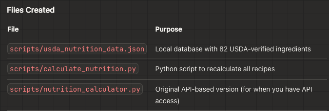 After creating scripts, Claude tries fetching from the USDA FoodData Central API, but fails because it didn’t have an API key. Instead it populated the local database with values from its memory and recalculated the macro files for all recipes.