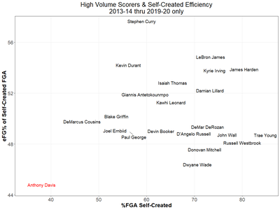 Ben Taylor lays out the pro AD case really well explaining how AD helps augment star players around him as the game's best finisher (and arguably the GOAT lob threat in NBA history). While Seth Partnow lays out the opposite case for why AD isn't at the very top tier of players because of his inability to initiate offensive at high volume or particularly efficiently per the chart below.