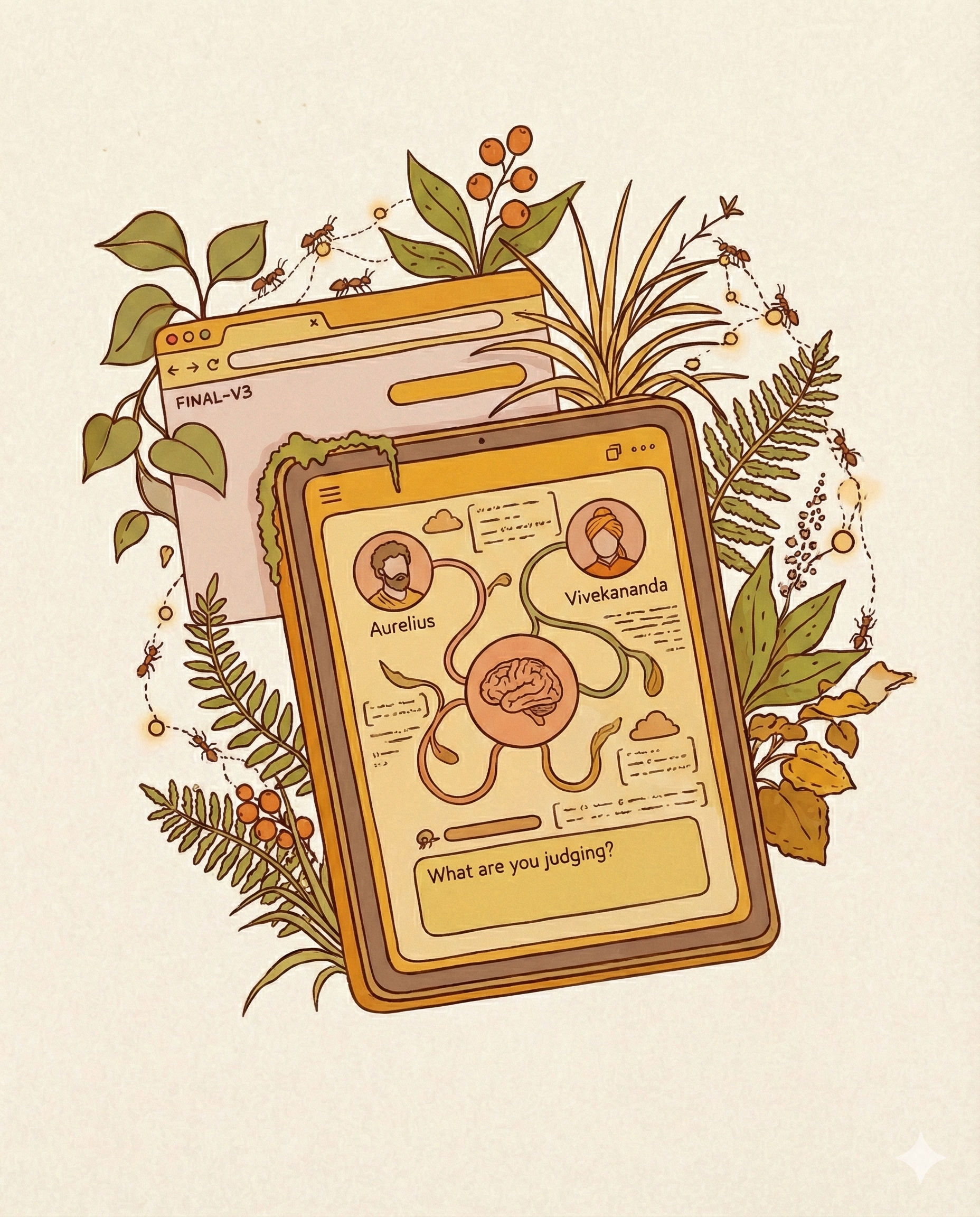 I spun up a specific "Claude Skill"—my own digital agentic ally. It isn’t trained on marketing data or code; it is trained on a unique blend of philosophy: Aristotle, Marcus Aurelius, J. Krishnamurti, and Swami Vivekananda.