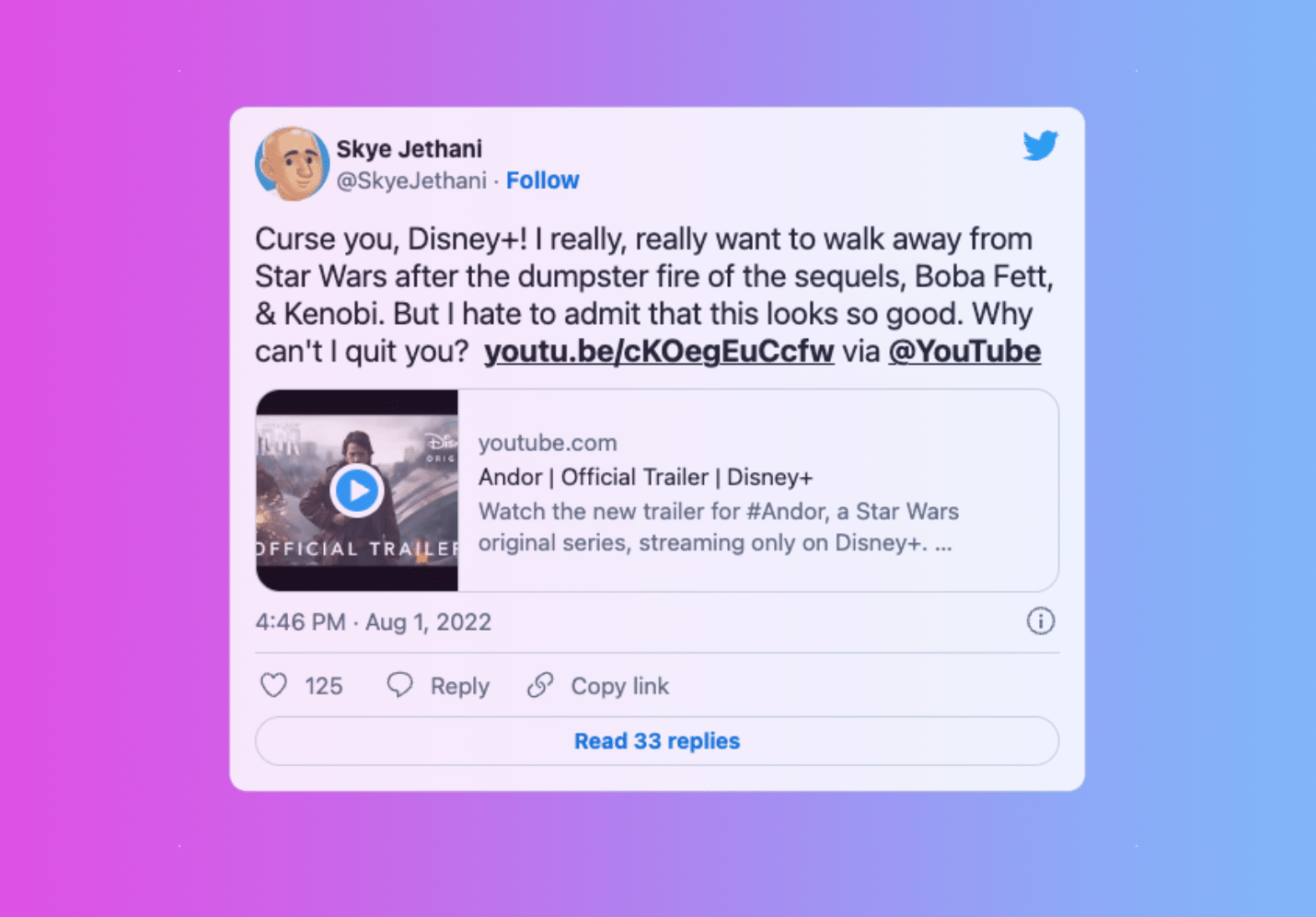 Into this discussion comes the trailer for the soon-to-be-released Star Wars series, Andor. Given how much I liked Rogue One, I’ve been very eager to see this show about its protagonist come to fruition. The preview to which we have been treated looks astonishing. Action, intrigue, moral considerations, transcendent worldbuilding: it seems to check all of these boxes and more.
