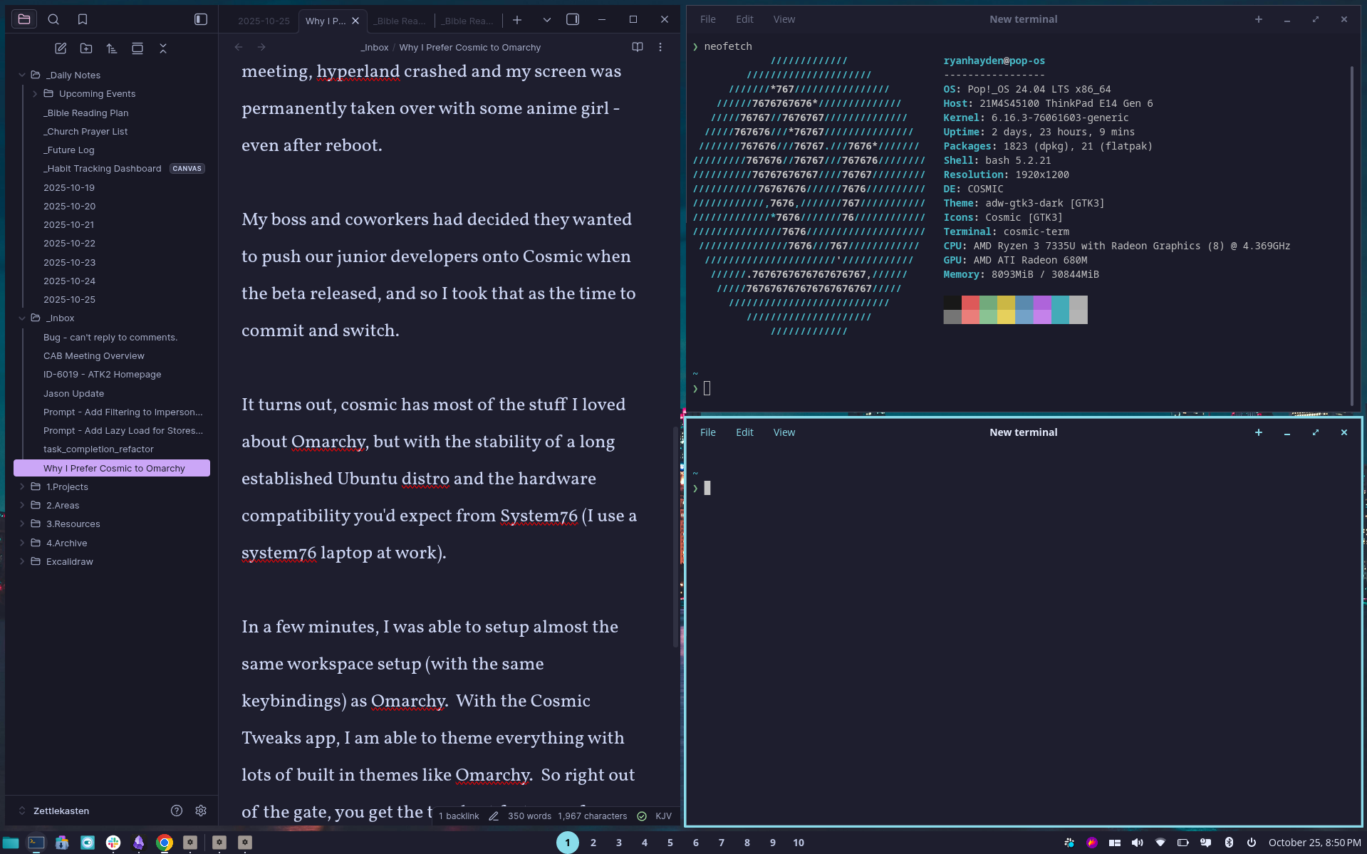 I was very big on the Omarchy Hype train pretty early, and ended up using it for awhile on basically every computer I have. But I've switched from Omarchy to Cosmic/Pop OS 24 a few weeks ago and I actually think it is superior.