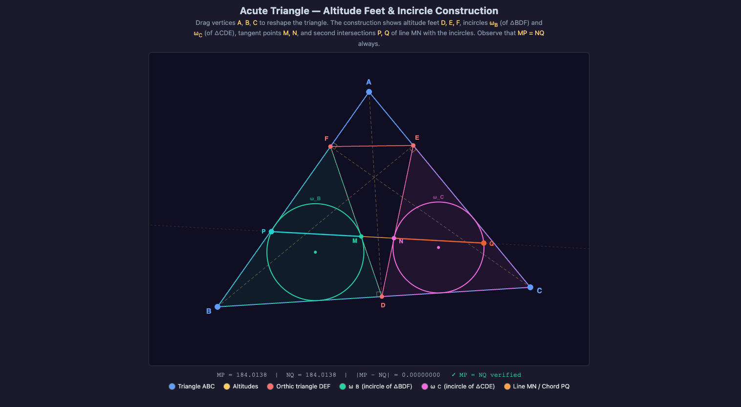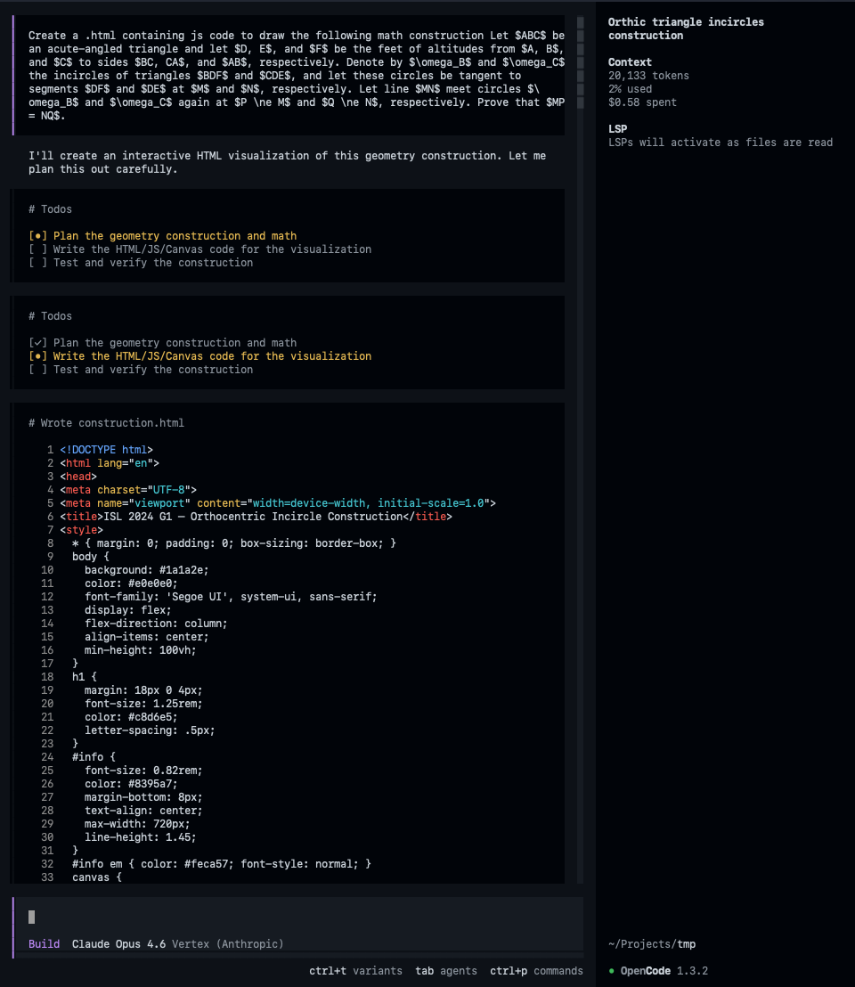 It is finally possible to use LLMs for drawing useful geometry constructions! The main reason I didn't like solving geometry problems during my days competing in math was that it just took so much time to draw the construction and start solving the problem. I am generally quite patient, but the problems I enjoyed solving the most were the ones that managed to captivate my attention as soon as I read them. Once in a while, I would check if LLMs were finally good enough to produce meaningful math visualizations, which is something I am very interested in (imagine having an AI that is able to produce visualizations that are as good as the ones by 3b1b). I remember, maybe 1 year ago, I was desperately trying to use Gemini to produce one geometry construction. It was quite a frustrating experience. Today I decided to try again. And I was quite surprised! Not only did the agent manage to create the code I asked it for, but it really exceeded my expectations.