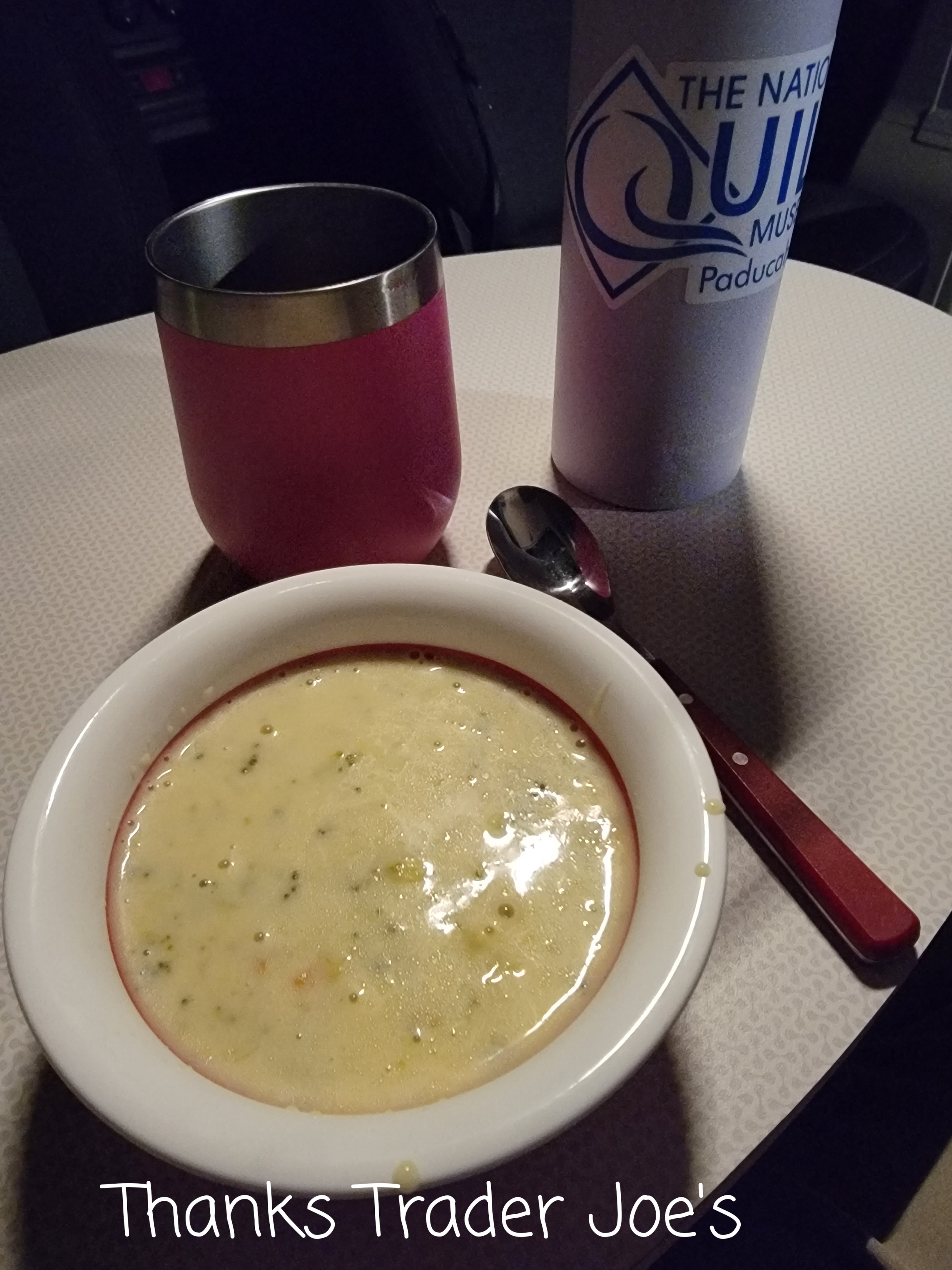 I was thankful for our previous Trader Joe's discovery as we enjoyed our simple supper of cream of brocolli soup. Such meals were easily heated on TCB's propane cooktop with our nested, removable-handled pots that were a birthday gift from Monica. Her YouTube research said that such nested pots were invaluable for #vanlife. We agree!