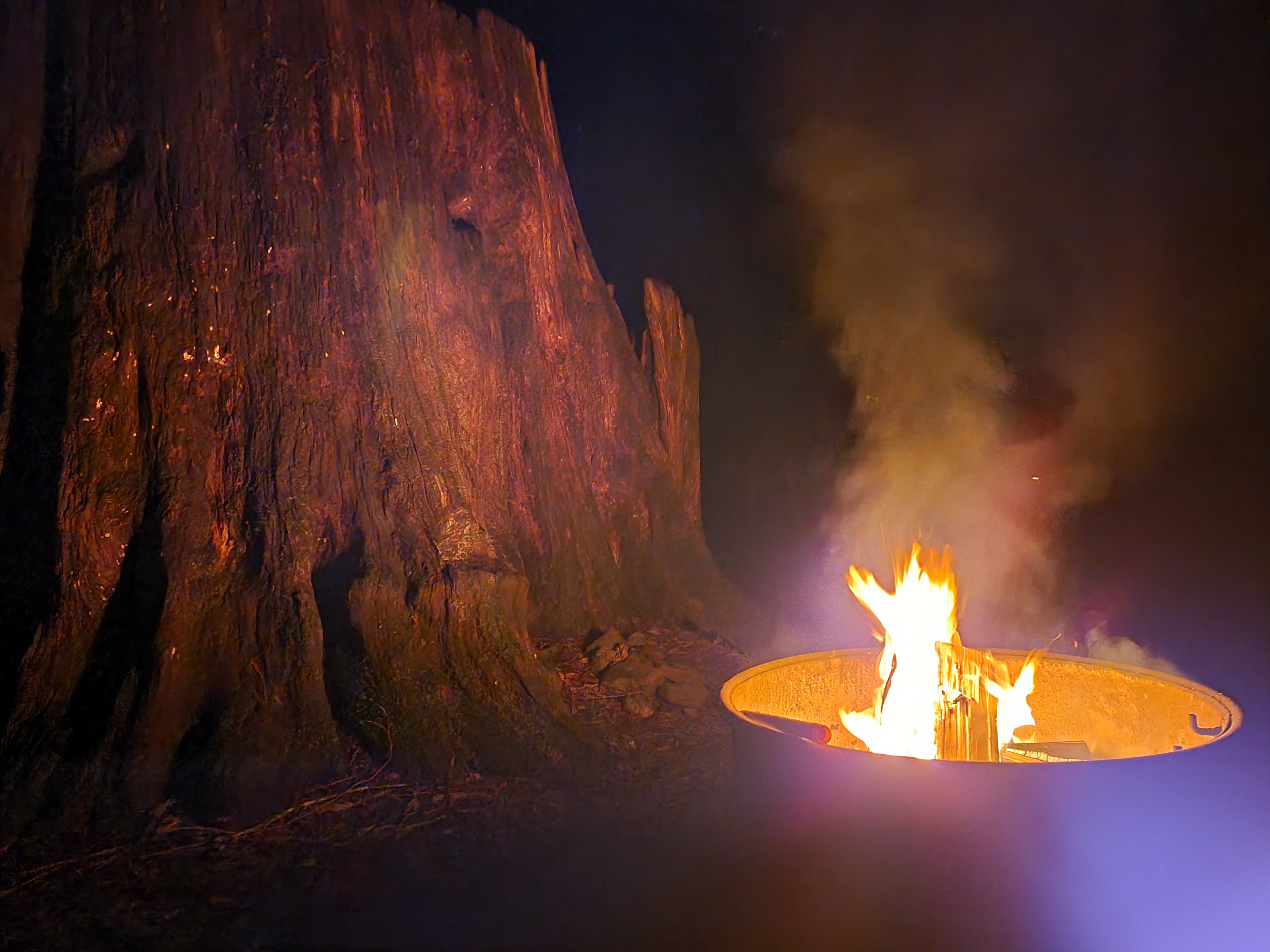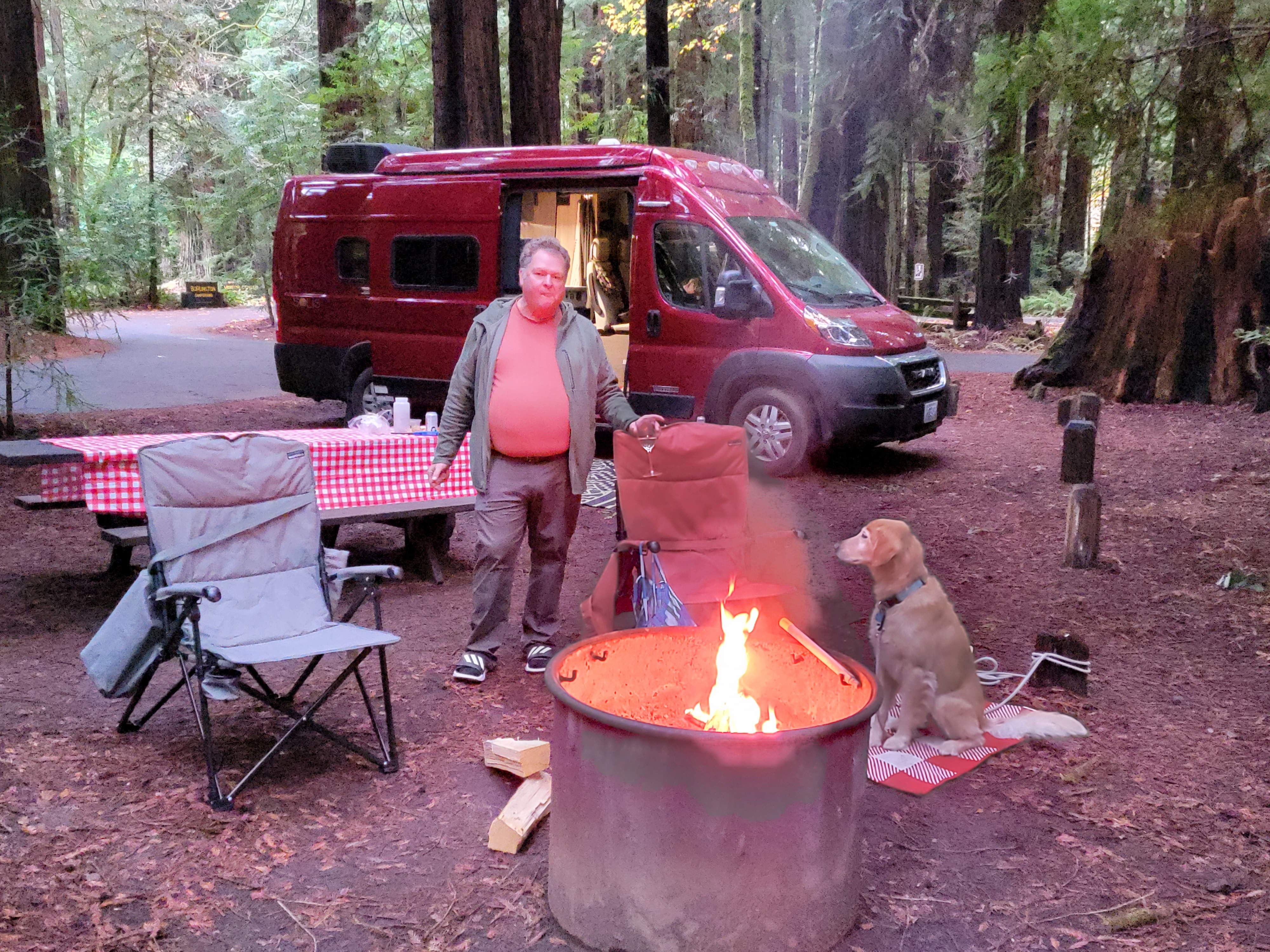 Upon return, Van opened one of our Napa finds to enjoy with some nibbles. He started a fire with wood purchased from the ranger. Canned soup from the pantry ended another successful day on the road.