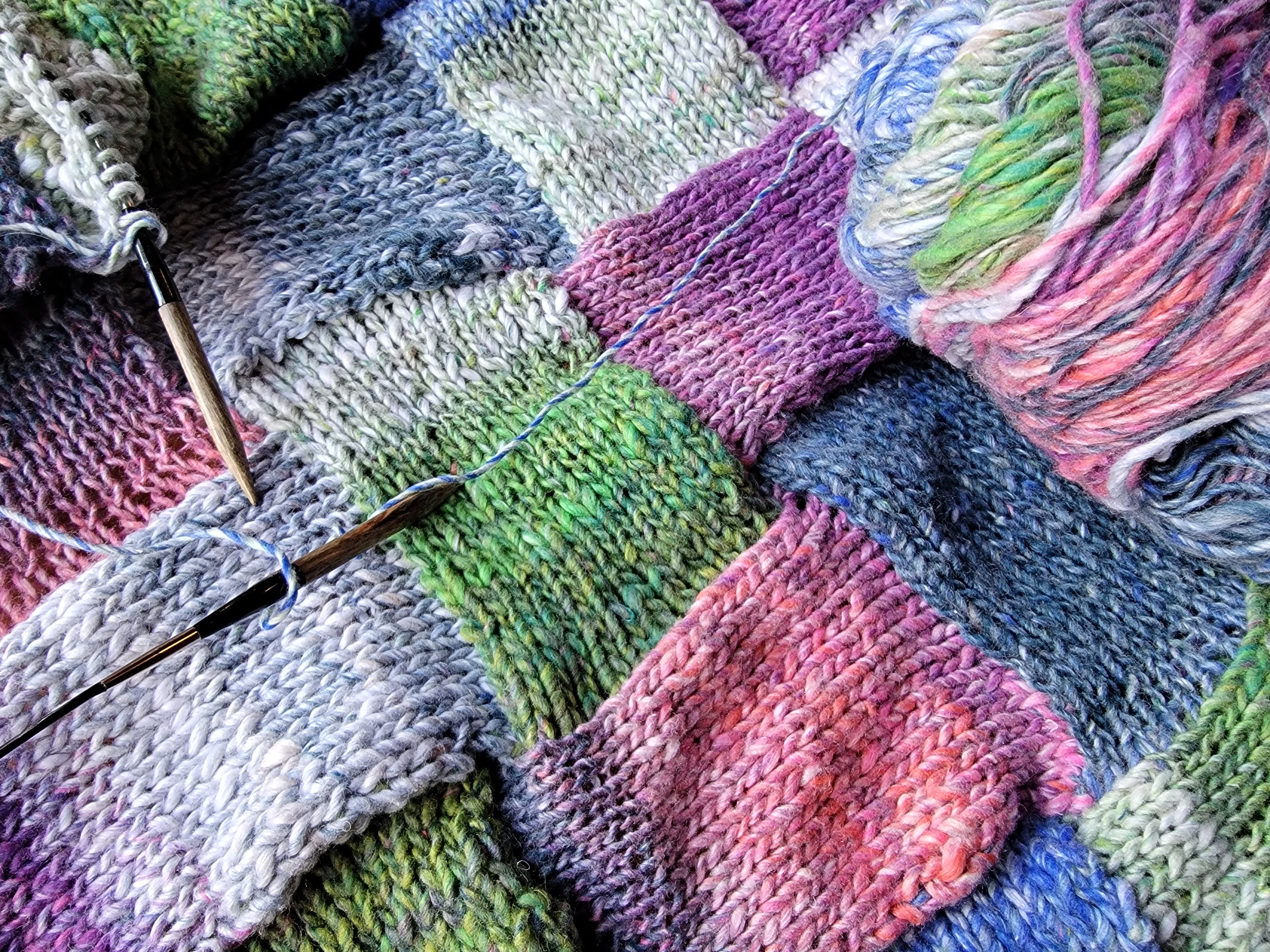 After setting up (merely putting out our trusty camp chairs and a ground mat), Van set out on a bike ride. Even at 2 PM, the forest was dark so I asked him to make sure he turned on his bike front and rear lights. Quinnbo, who was happy to be out in the fresh air, sat beside me on the mat while I knitted some rows on my entrelac shawl.