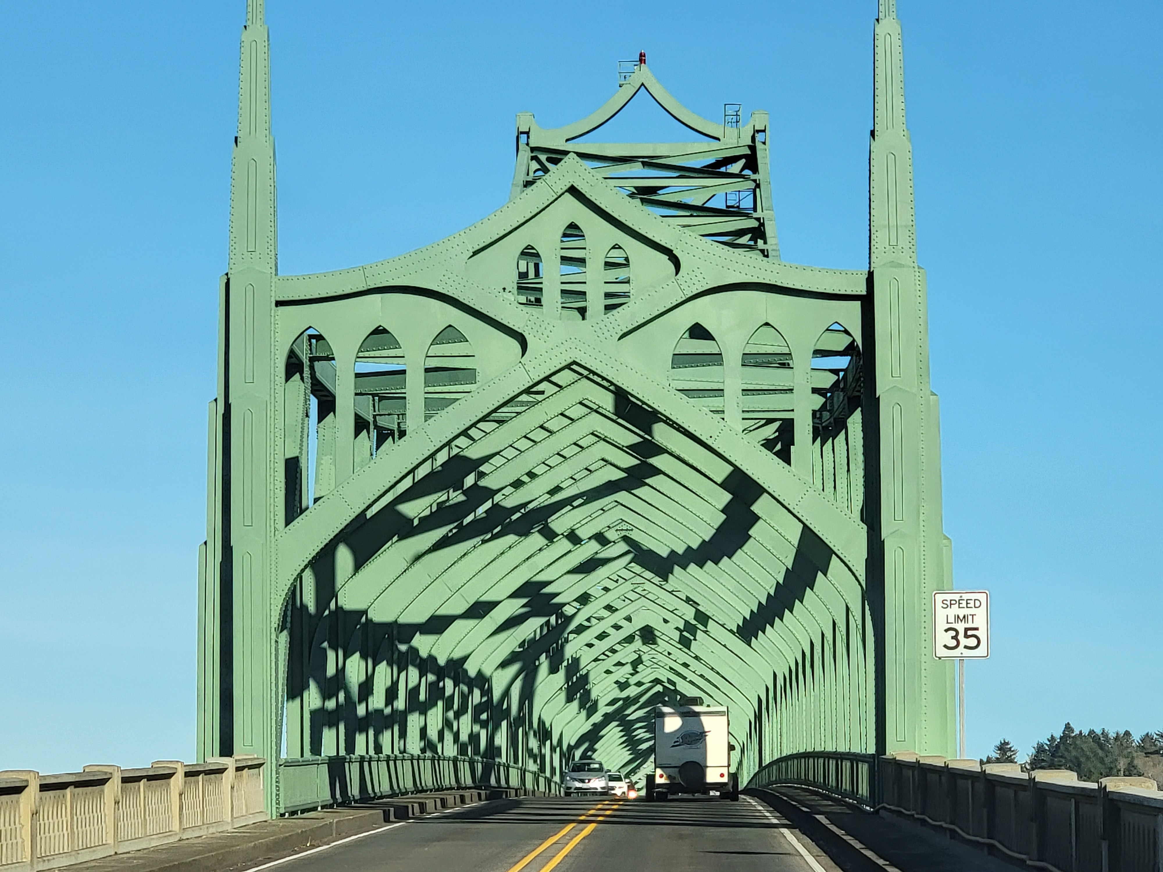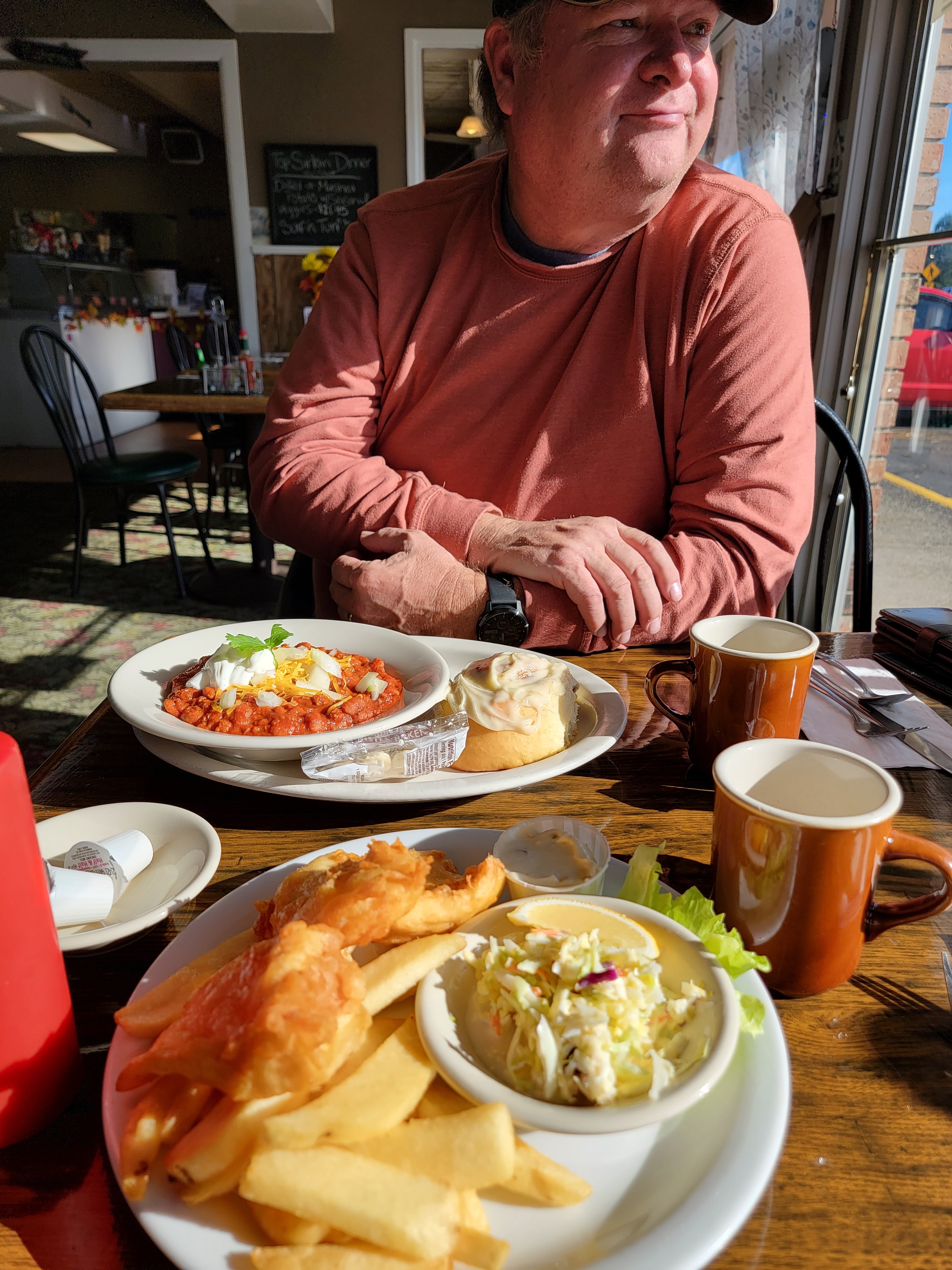 We stopped for an early lunch in Reedsport, at a small roadside restaurant, as their sign for halibut fish and chips drew us in. After catching an halibut during a fishing charter with Schuyler in Juneau, AK, my favorite fish became this tender, white meat of the frigid Alaskan deep waters. So delicious! The special, a bowl of chile with a side cinnamon roll was too tempting for Van to pass up. Top it off with a fresh pot of decaf made just for us and we were ready for the next leg of our short trip northward.