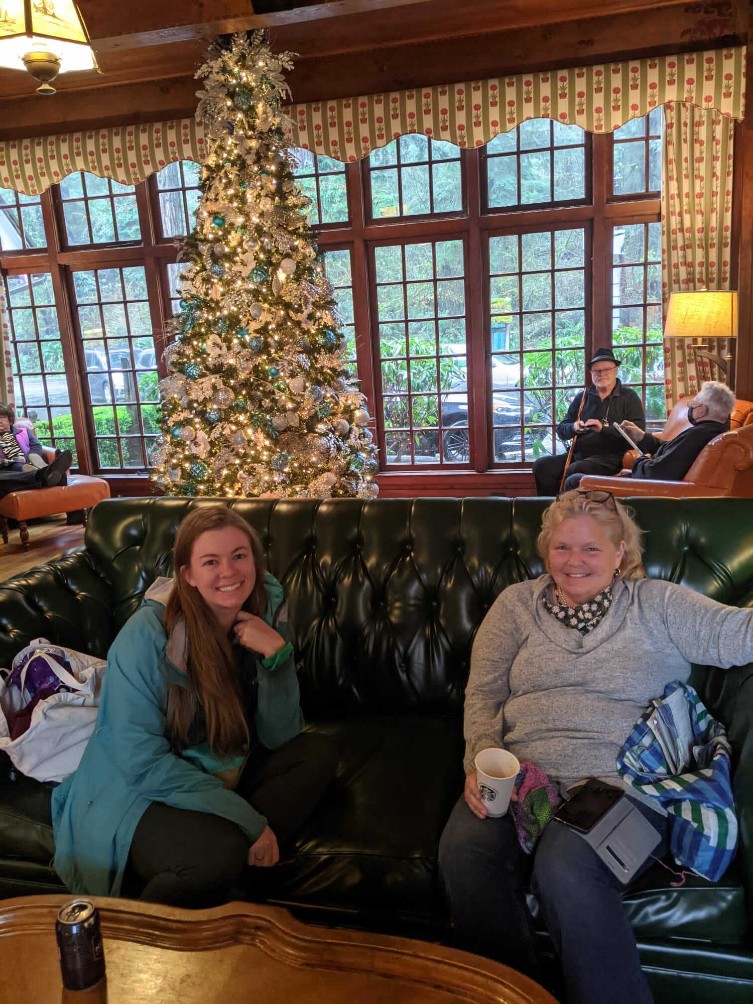 The weather had turned from mist to heavy downpours. This rainforest weather would be terrible for driving in the curvy, leaf-covered roads. As the family arrived, one auto by one, my relaxation meter increased exponentially. We waited by the large fireplace in the oversized leather couches of the main lodge. Lounging beside the beautifully decorated Christmas tree with loved ones, beverage in hand, I felt like we were on the set of a Hallmark holiday movie.