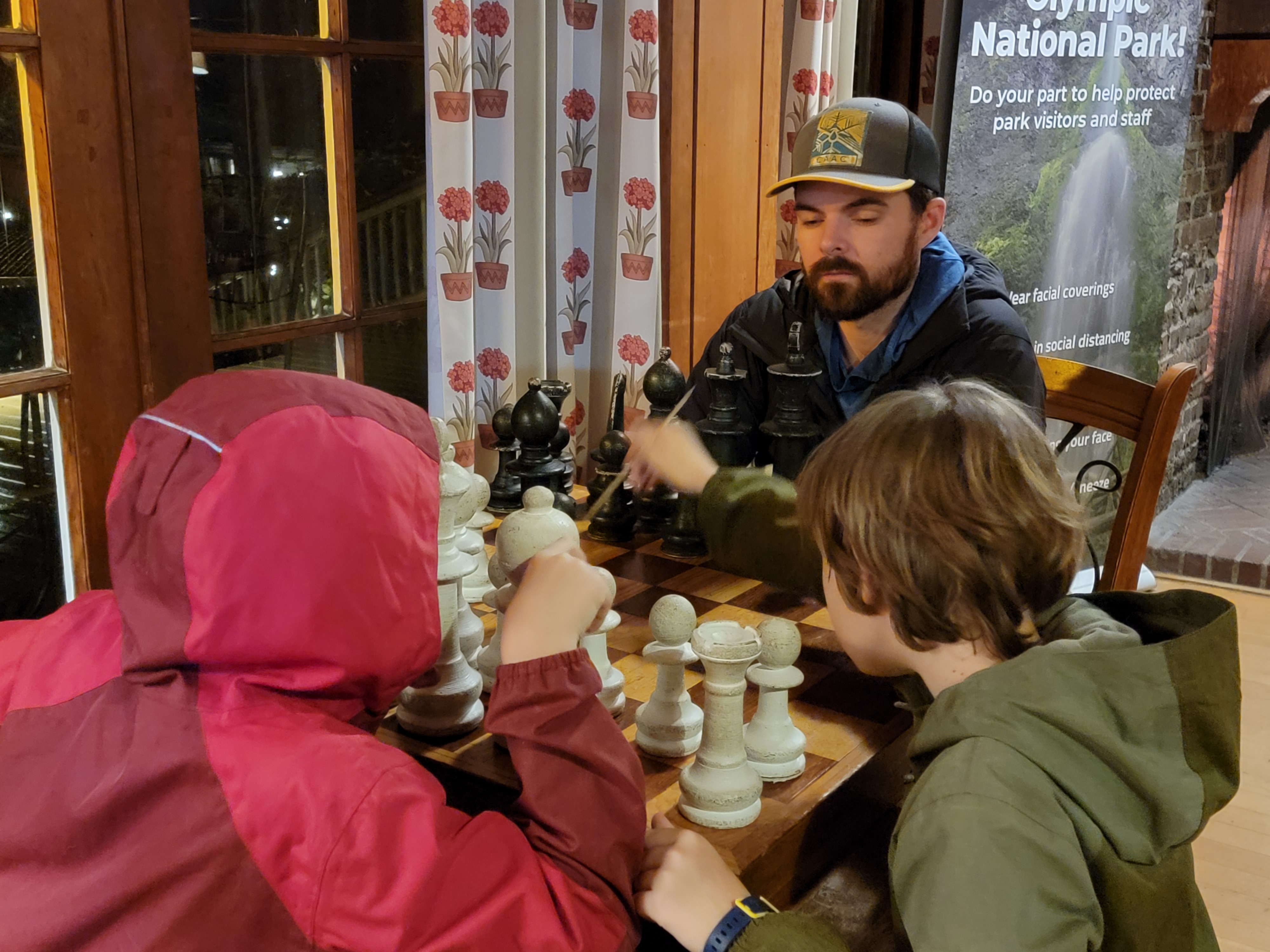 We passed the time waiting. Ian, Kai and Schuyler enjoyed playing on the oversized chess board near the fireplace. It seemed everything was oversized at Lake Quinault.