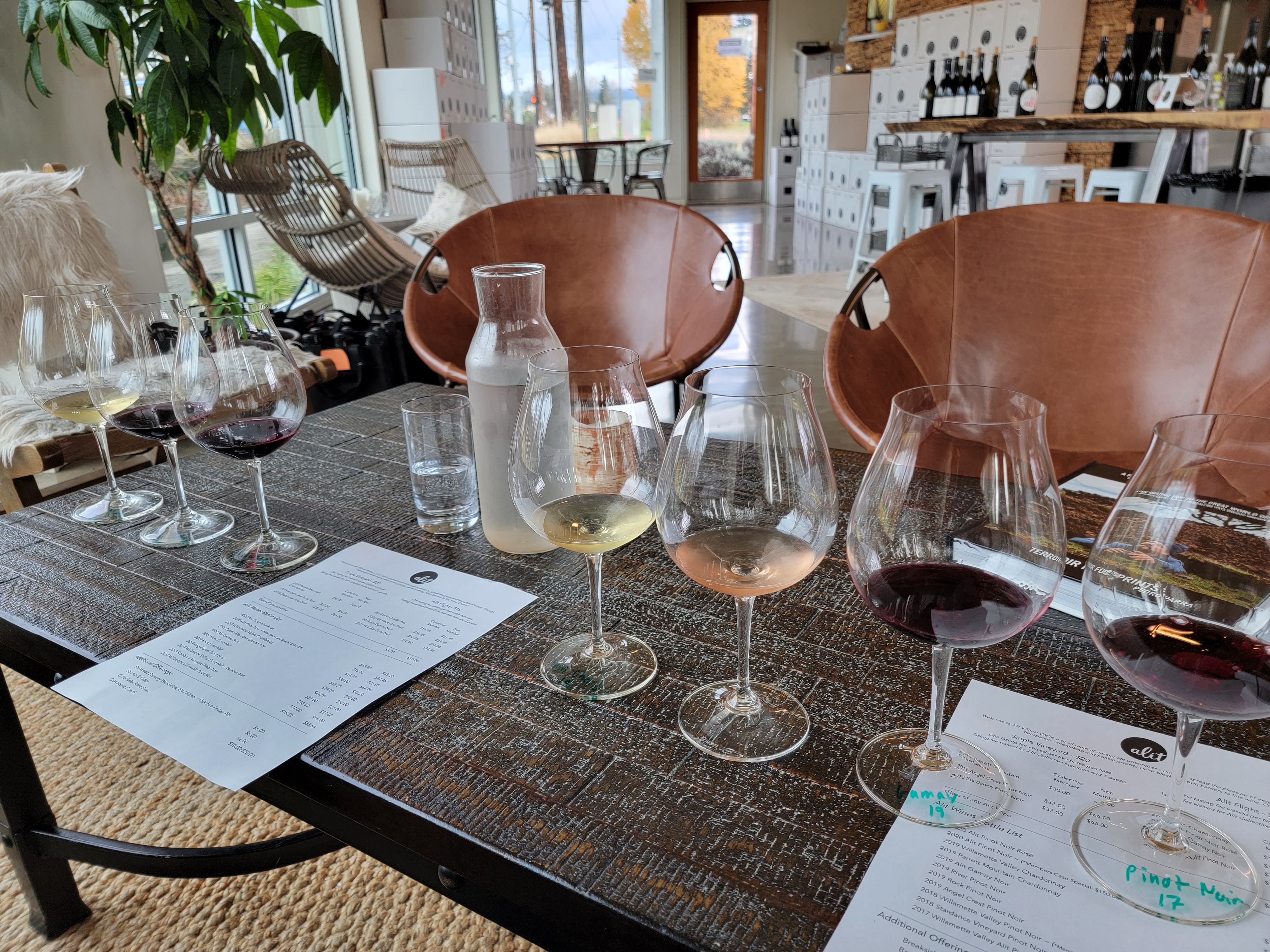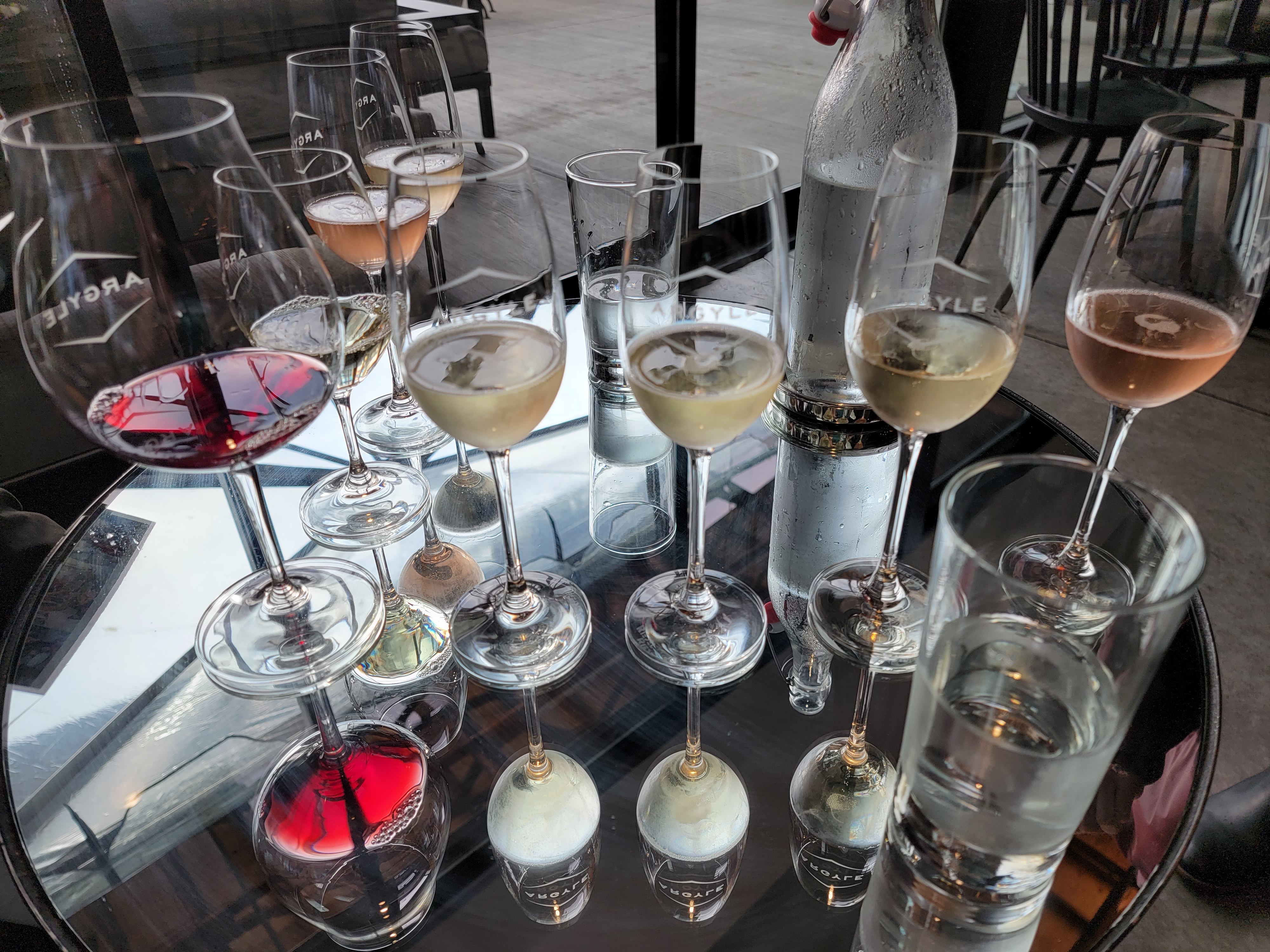 At 2 PM, we tasted at Argyle, only a few blocks from Alit. They specialized in sparkling wine. Their mirror-topped tables created a beautiful setting for all the different colors of wine.
