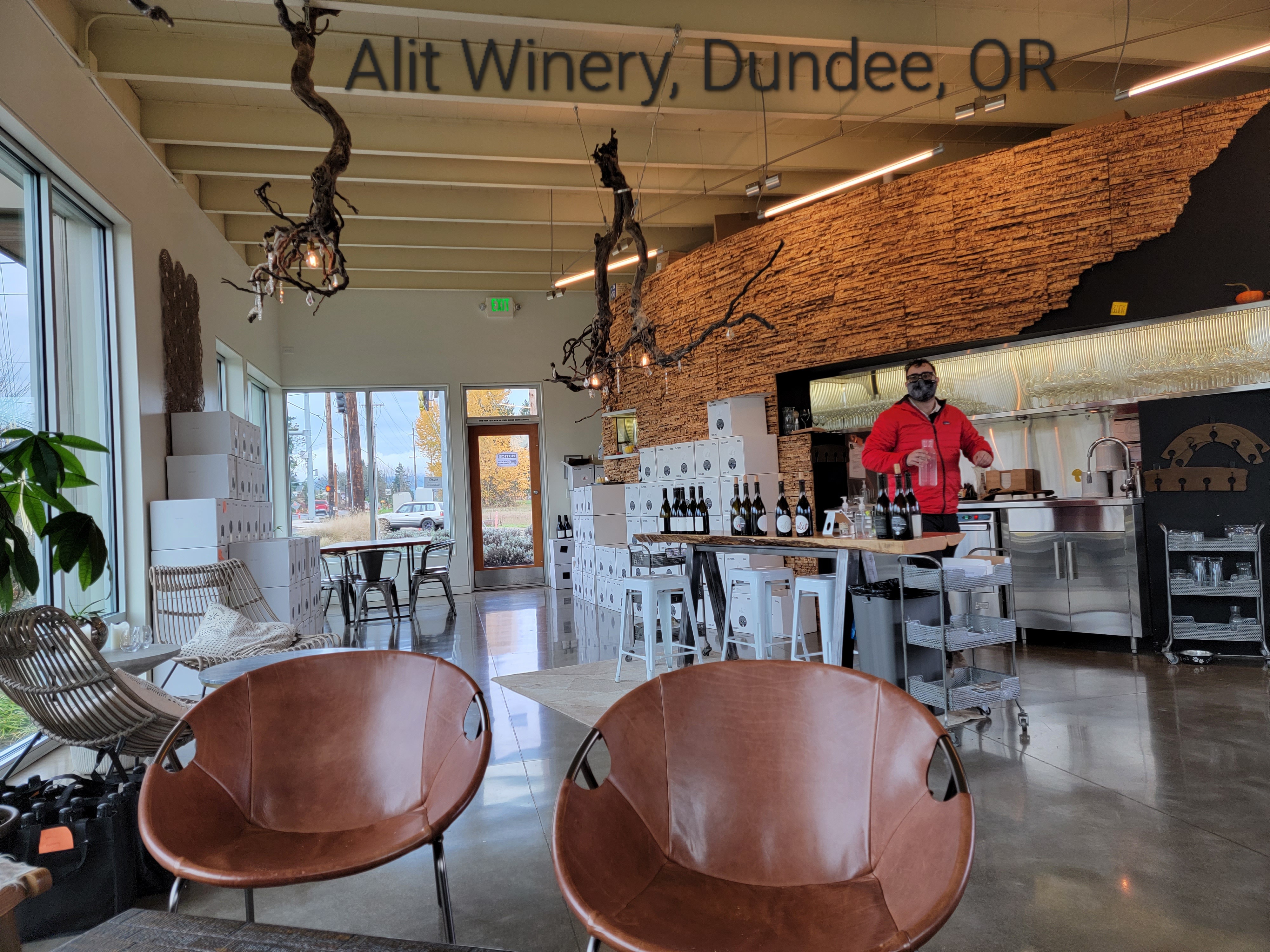 We had a 12 noon appointment at Alit Winery in downtown Dundee for wine tasting. It was an experimental, small winery that stood for natural processing using yeast from grapes only and no added yeasts, unlike other producers. The sommelier was very charming and patient as he answered Van's numerous questions about the wine market.