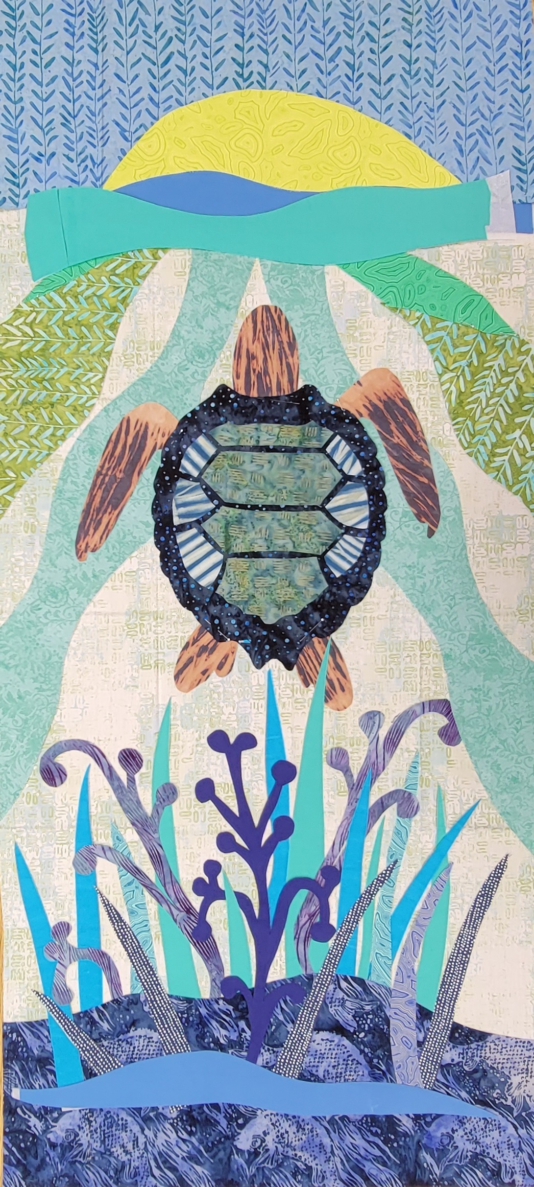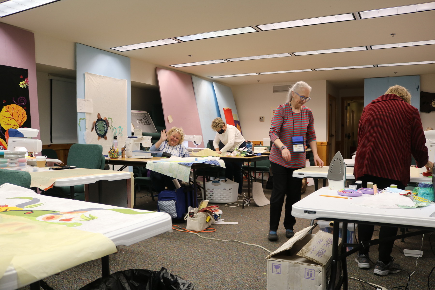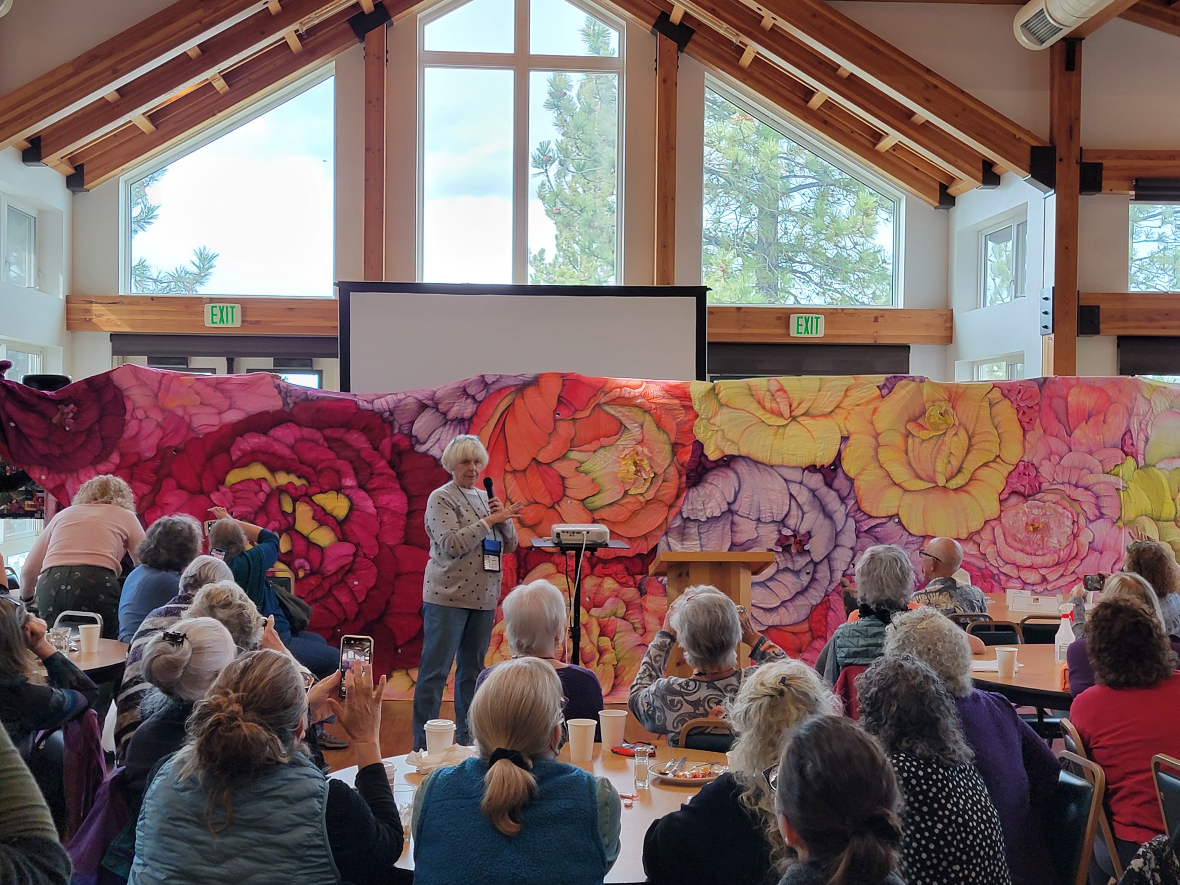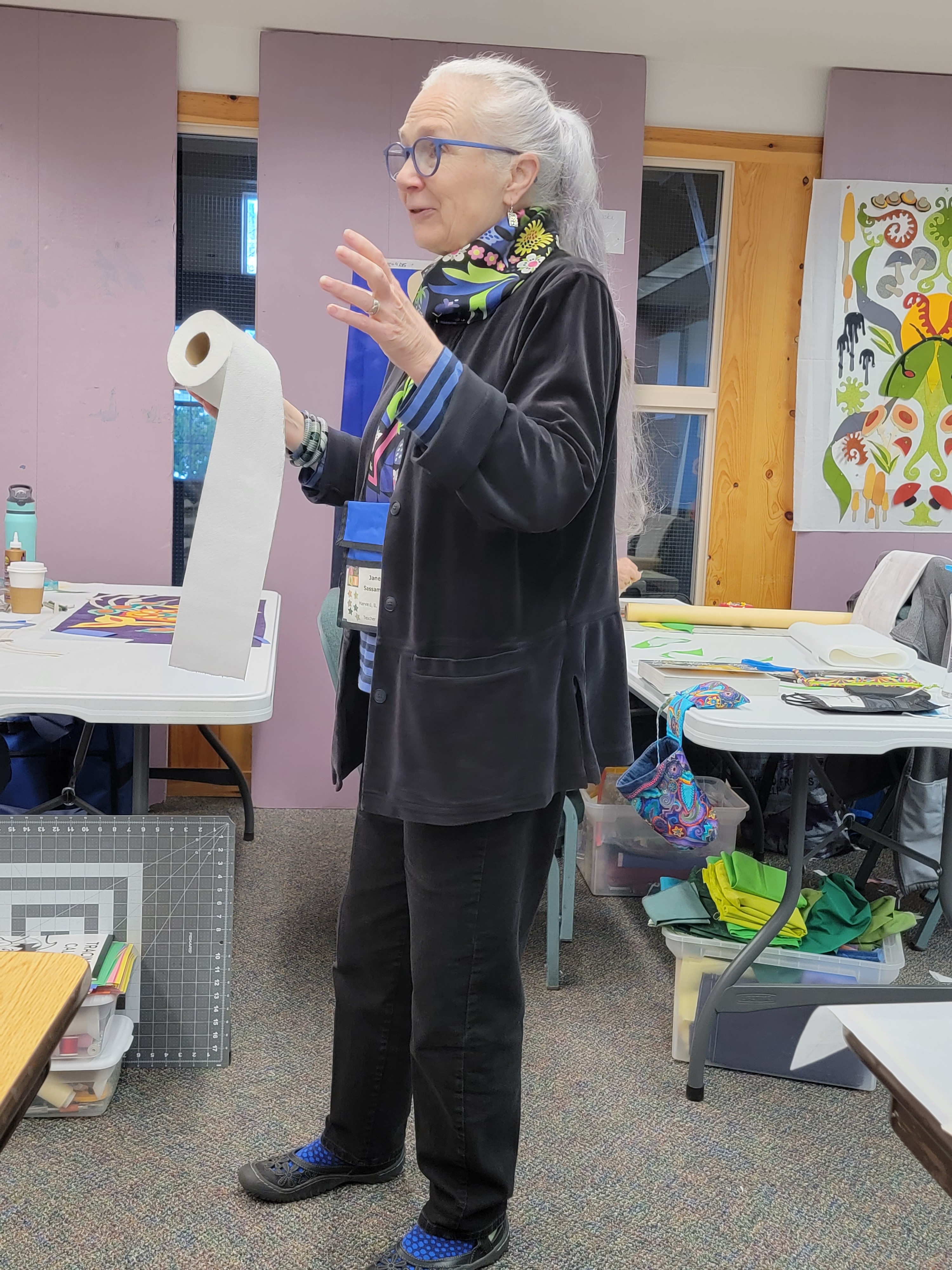 Teacher Velda Newman discussing her 30' ×8' hand dyed and hand stitched art quilt