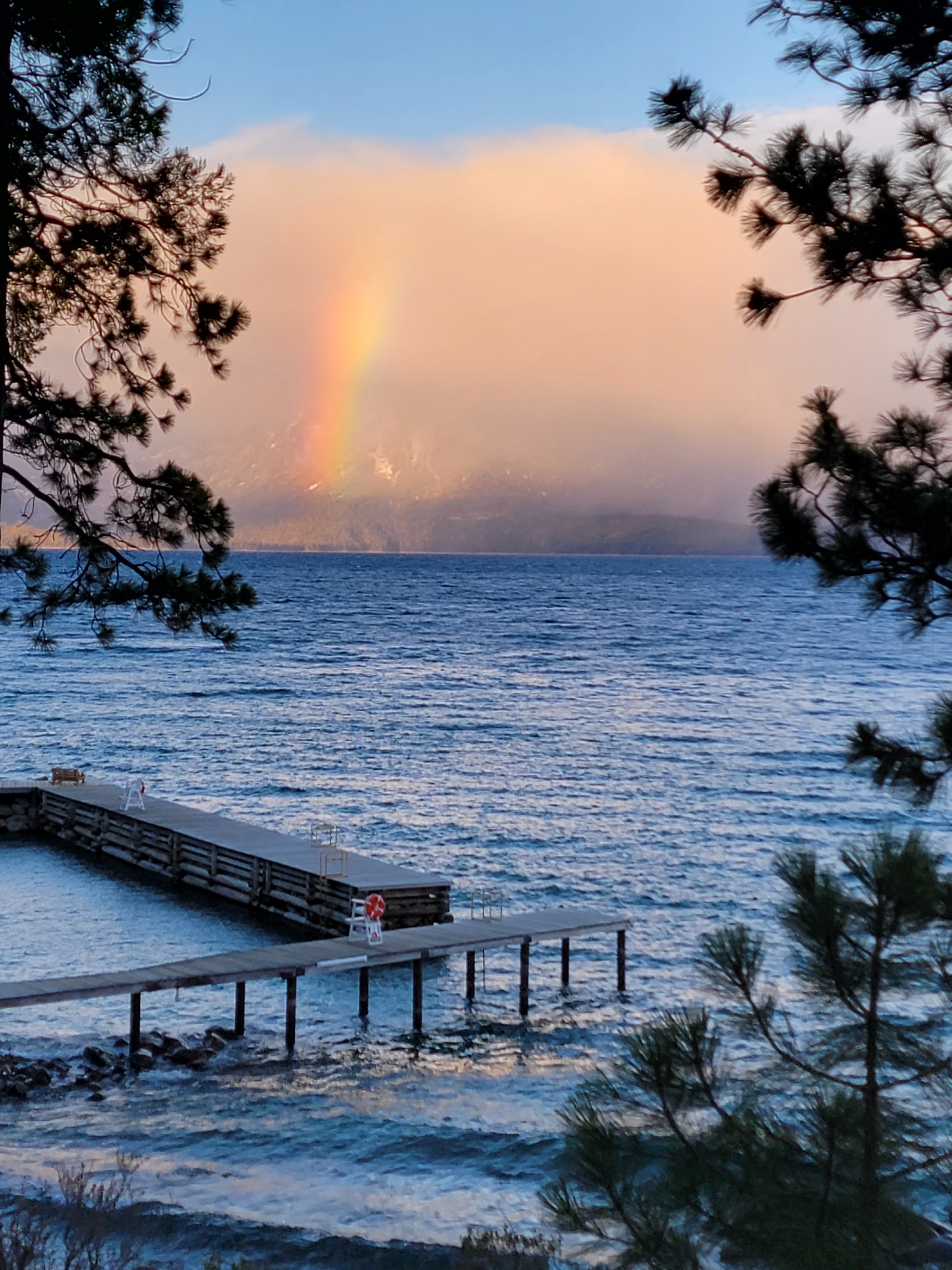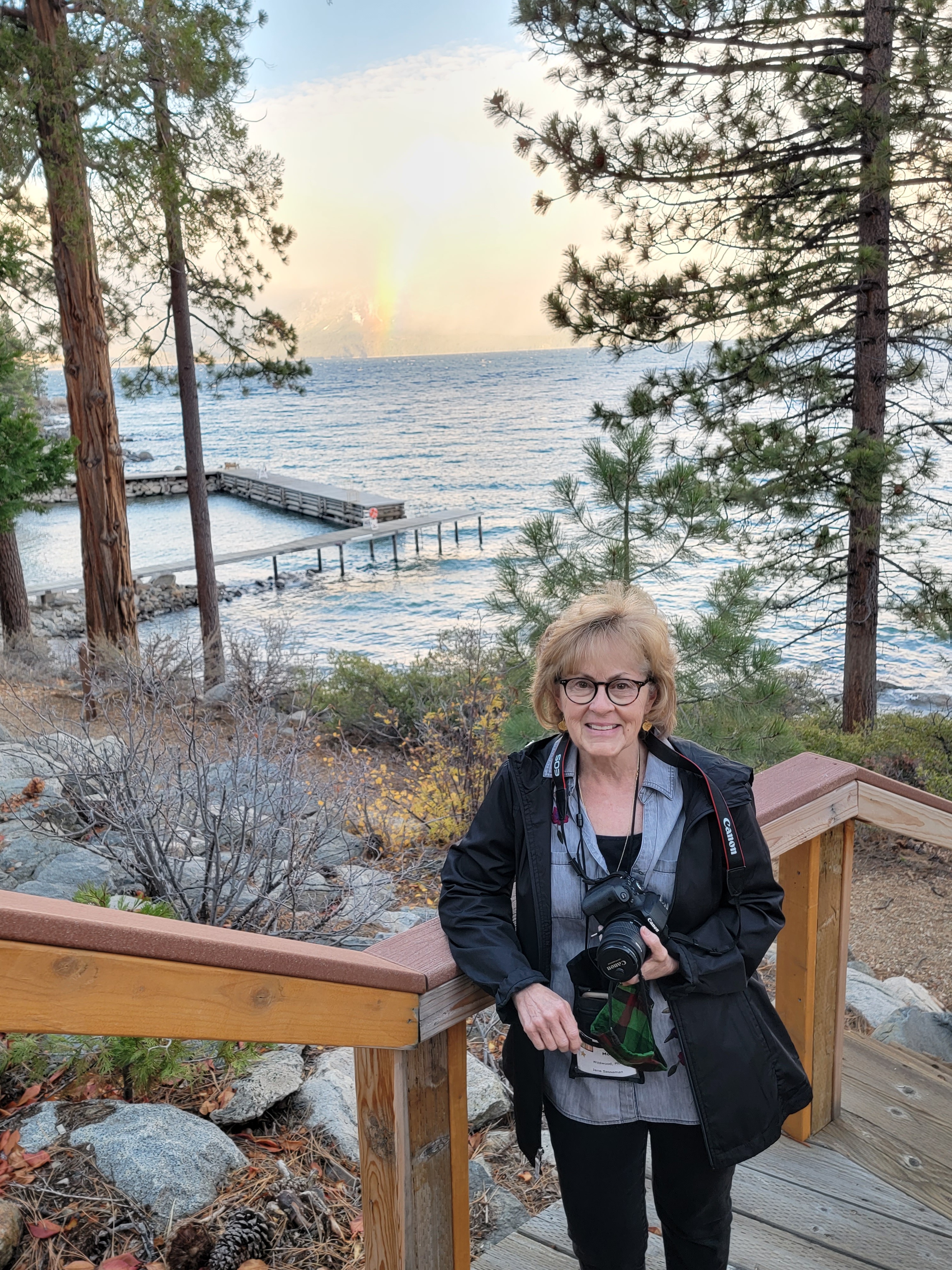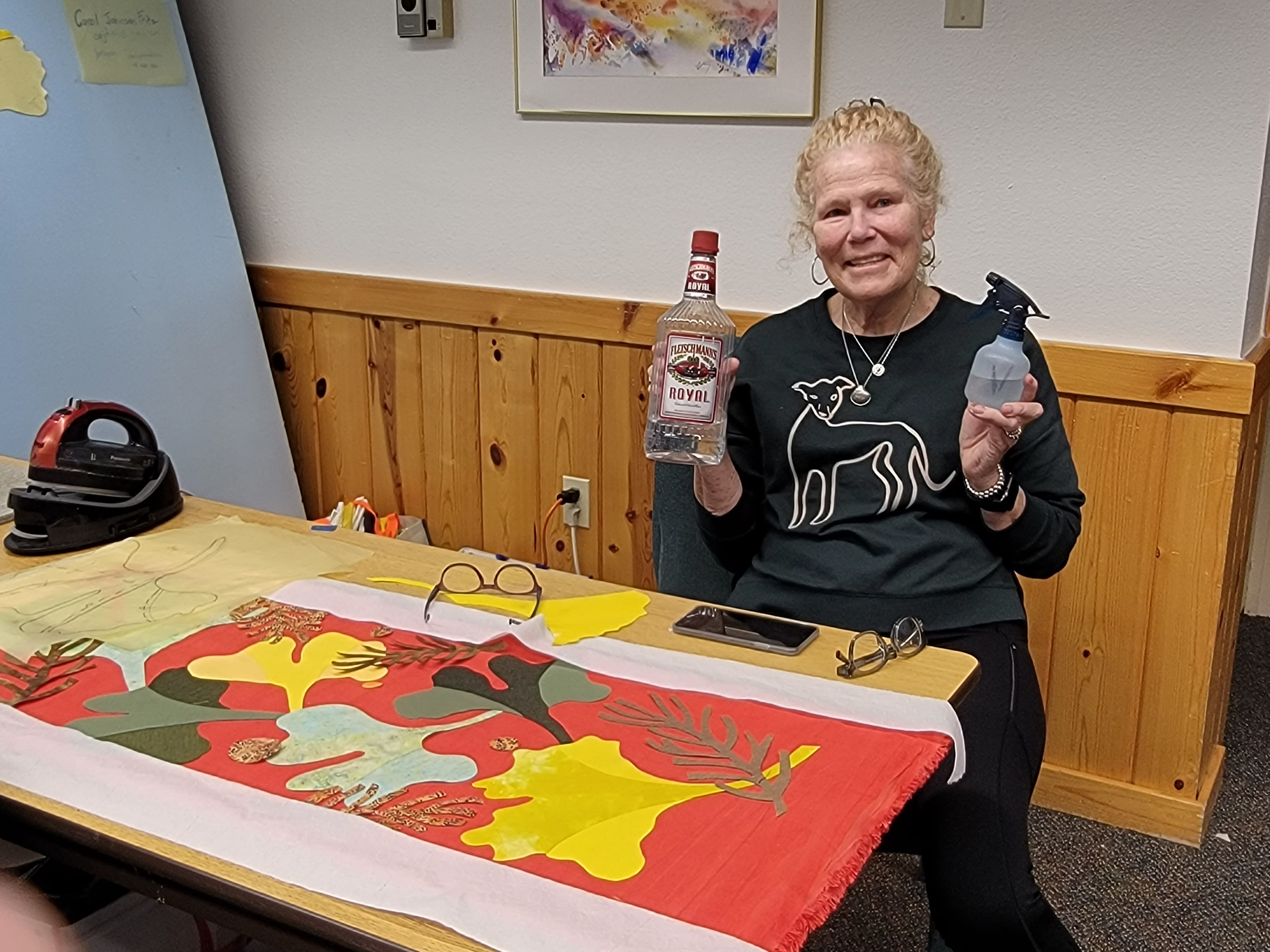 A view from outside our classroom with a full spectrum rainbow hovering for over an hour My classmate who used vodka as spray starch. Hmmmm... Her piece was beautiful. My new friend and sewing buddy Patti from St. Louis, MO. We sewed late into the night together while our hubbies were at the same campground with the dogs. She was a doppelganger of a dear friend from Norfolk. Can anyone tell who?