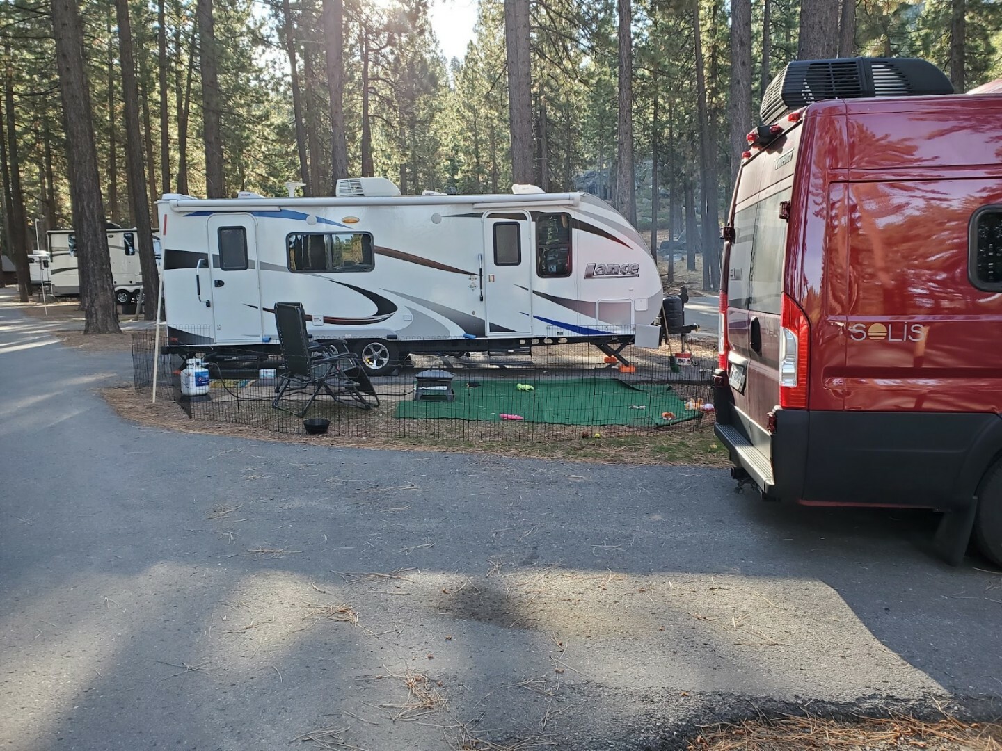 While I was working and learning with my "peeps" at Art Quilt Tahoe, Van spent his week a mile down the road at Zephyr Point Campground and Resort in TCB with Quinnbo as his sidekick.