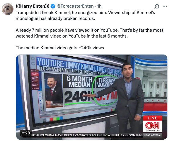 ------- OK, Grok. Here is why I think this is impossible. First, I don't watch Jimmy Kimmel. At all. I did last night. My wife missed it, so I played it for her this morning (the recording). The 'world' was talking about the return of Jimmy Kimmel and how the ratings were going to be off the chart. The number (millions?) of people who never watched Jimmy Kimmel in the past, tuned in last night at 11:30 PM EST to see what's going on. I was one of them.