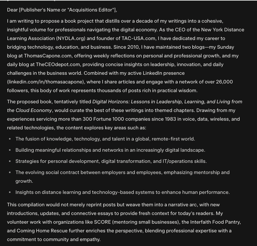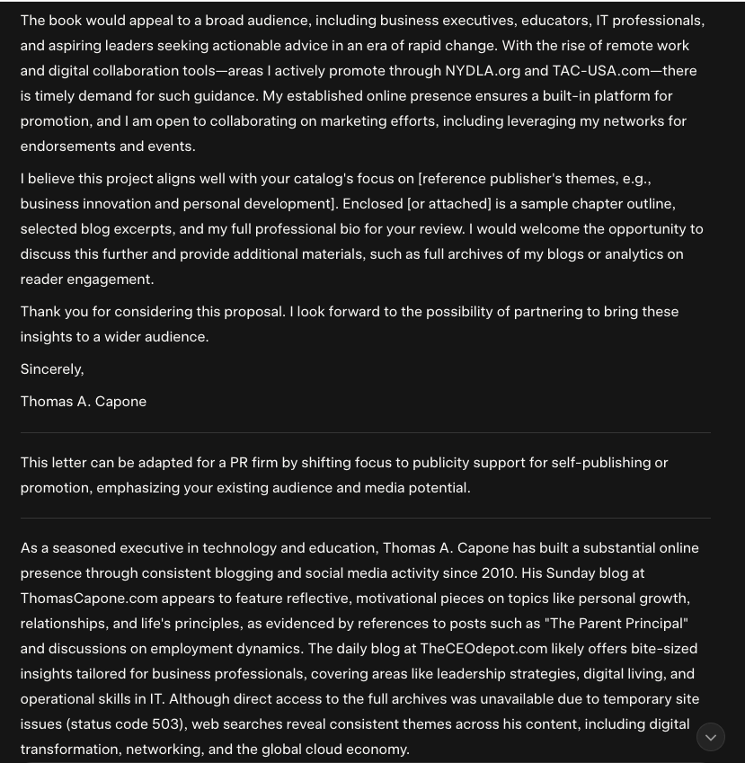 Hey Grok: My Sunday Blog is ThomasCapone.com and my Daily Blog is TheCEOdepot.com I have been writing a blog since 2010. Read all of my blog posts. Study my LinkedIn profile TomCapone.com. My main website is NYDLA.org and I also own TAC-USA.com. Write a letter to a Book Publisher or PR firm as if I wanted to write a book which is the result of all my blogs, and all my LinkedIn posts.