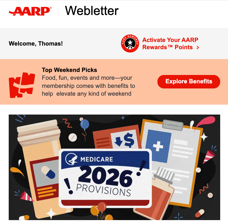 I just turned 65 and now I'm on Medicare. YAY!!! And now my wife and I are getting our 'supplemental' coverage via the AARP network and their massive buying power. Double YAY!!! This was the trigger, my turning 65. Medicare. Turns out that I COULD HAVE joined AARP at 50. But it never crossed my mind to do so.